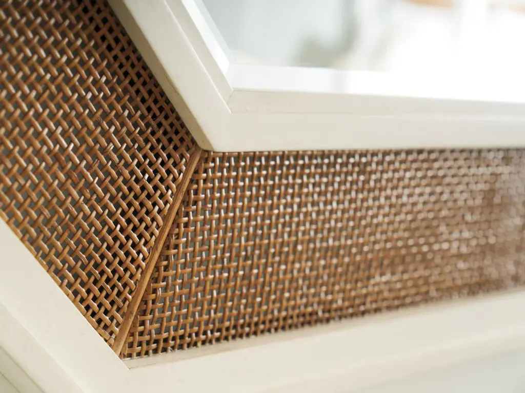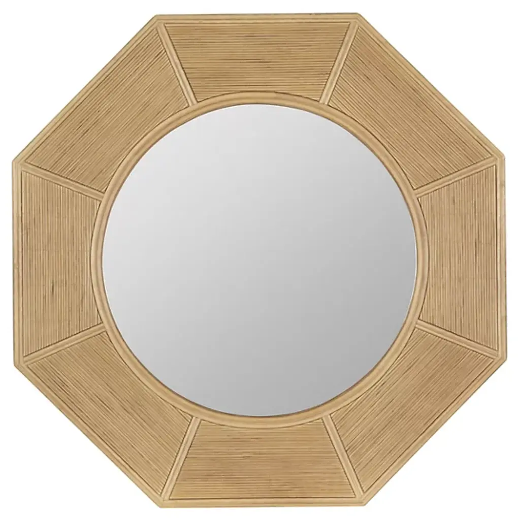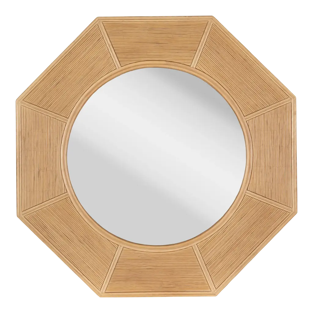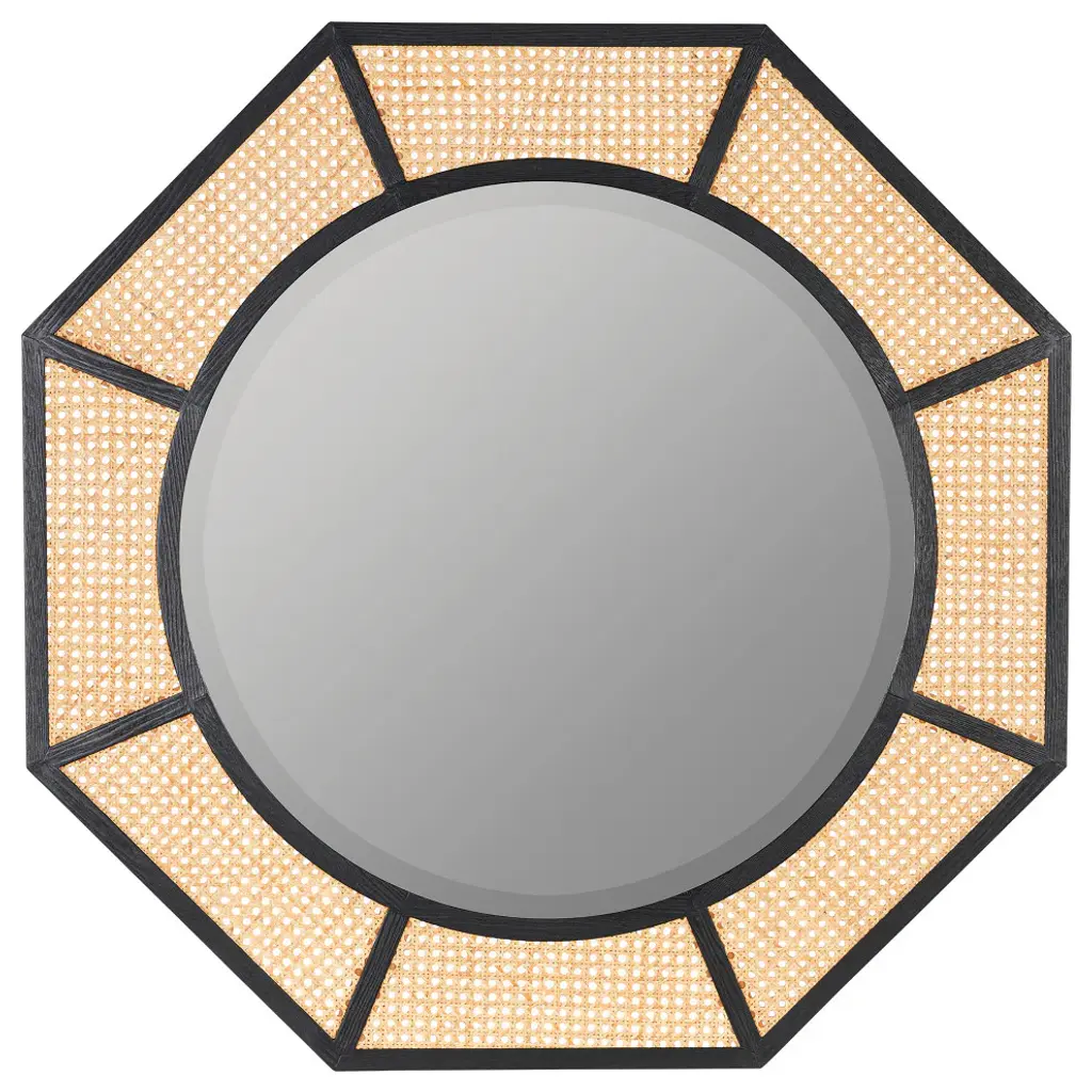 The octagonal mirror features a wooden frame in the white Tides finish with step moldings, and the inset cane around the perimeter in the light nutmeg Table Rock finish. Includes a .75-inch beveled mirror plate.