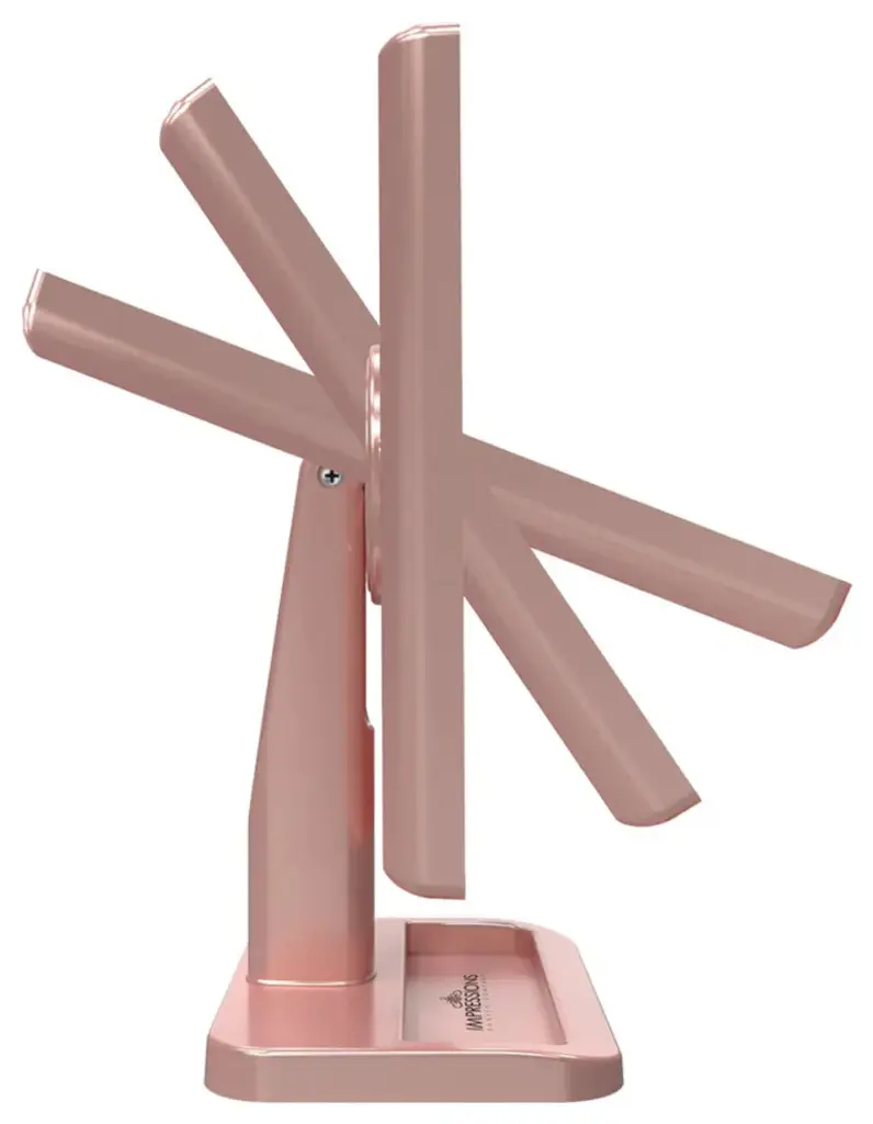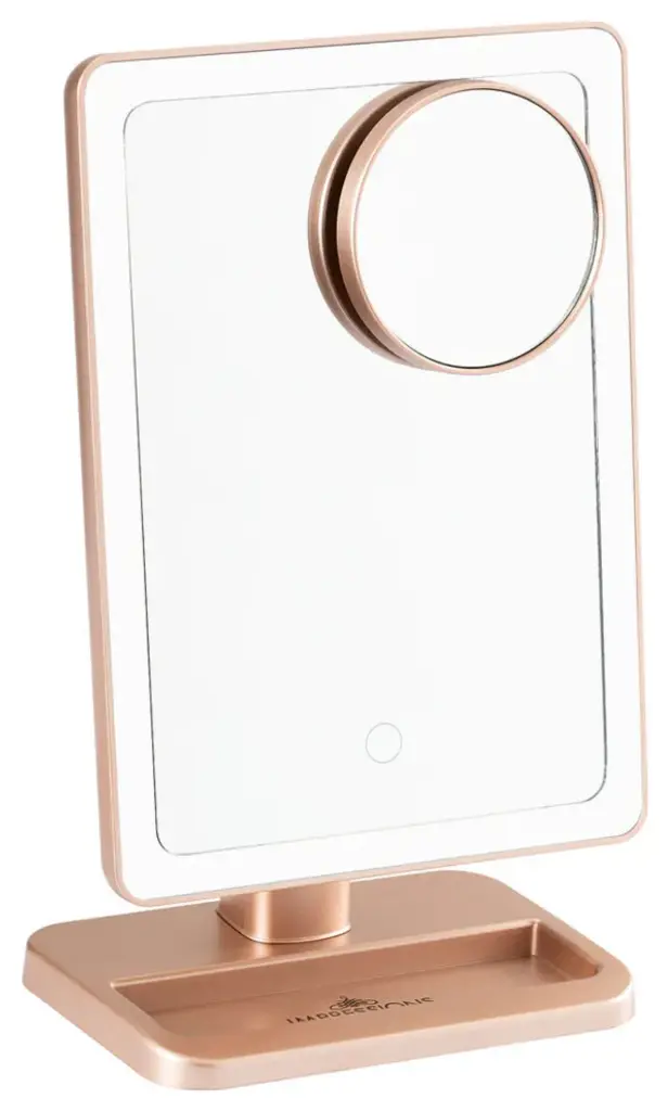 Impressions Vanitys Touch Infinity XL LED Makeup Mirror with illuminated light and portable feature. This lighted makeup mirror has energy saving bright LED strip lights, which are activated and dimmable via a touch power sensor. The base includes a storage section to store your earrings, makeup brushes, and other smaller accessories. Powered by batteries so you can take it anywhere with you.Features:SMART TOUCH MIRROR: This tabletop makeup mirror has energy saving bright LED strip lights. To turn the mirror on or off, simply tap the touch sensitive power switch on the mirror surface or hold it to adjust the brightnessMAGNIFYING MIRROR: This face mirror has a detachable 3.5 inch 5X magnification round mirror that is included with the suction so it can be placed in the corner of the mirror for each detail workSTANDING BASE: This vanity mirror comes with a base that includes a storage section for storing your accessories. Also, this mirror can be tilted 360 degrees and swivel from 180 tall to wide for a better viewing angleCHARGING EXTENSIONS: This lighted mirror has a flip power switch behind the mirror and is powered by 4 x AA batteries so you can take it anywhere