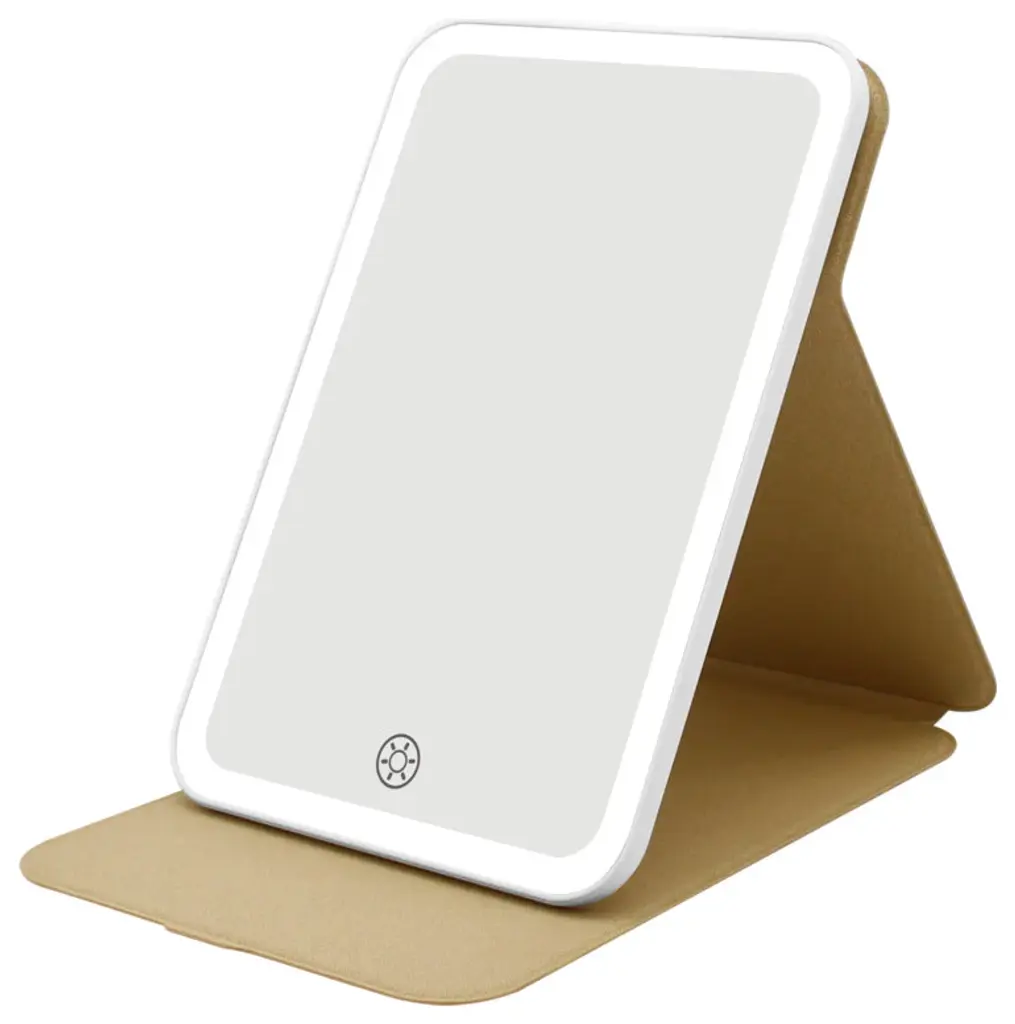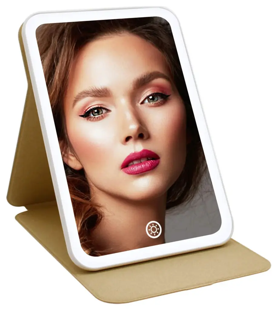 Impressions Vanitys touch tablet mini tri tone travel makeup mirror upgrades your vanity with its modern features and elegant design. The hand mirror is designed with ultra bright LED lighting and a portable frame so that you can apply your makeup in any room. Our smart mirror features a touchpad. On or off the mini mirror just by tapping the switch. The dimmable LED lights of our handheld mirror will create the perfect environment for your makeup. There is a folio cover to protect your lighted vanity mirror from different situations. The folio cover is not only sleek in style but is multi purpose. It protects the LED mirror along with serving as a base stand, so you can get glam hands free. This LED vanity mirror with lights is portable and travel friendly. The makeup vanity is the ultimate piece to take with you on all your adventuresFeatures:SMART MAKEUP MIRROR: This portable mirror has a soft touch sensor dimmer switch. You can turn the light up mirror on and off with a simple touch. Make this cosmetic mirror your travel companion just like your mini tabletLIGHTED MIRROR: This lighted mirror has built in long lasting daylight LED strips to stay calm. Our mirror with light creates a makeup studio environment and helps to give you the perfect makeup without any worriesFLIP COVER PROTECTION: These personal mirrors have a user friendly folio cover that protects the rectangle mirror. Besides this foldable cover serves as a base stand. The folio cover of the mirror vanity is not only sleek in style but is a multi purposePOWER SUPPLY: Our face mirror has a USB rechargeable battery that can save energy and easily recharge it. So you can do makeup whenever you need without getting the tension of charging with the led makeup mirror