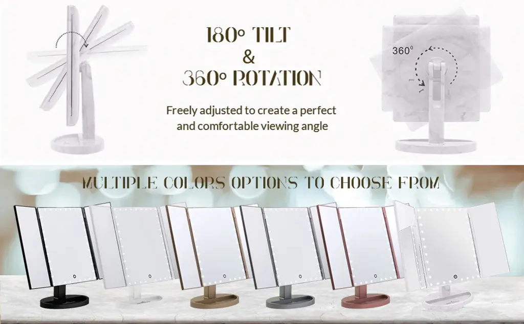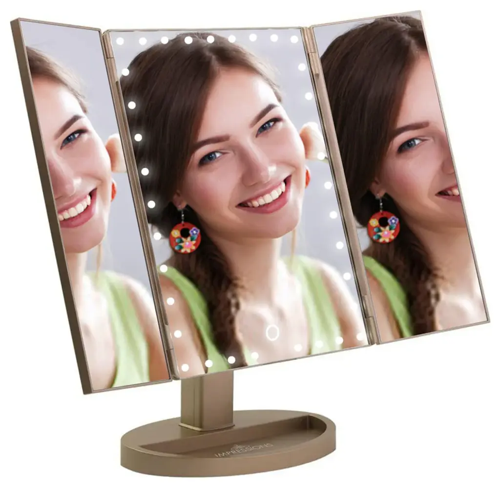 Impressions Vanity touch trifold XL LED makeup mirror elevate your artistry to a whole new level. This mirror has a built-in bright LED strip light. Hold the top touch sensor in the mirror with lights to turn the mirror on / off and adjust the brightness. For the best views, the vanity mirror can adjust up to 180 degrees and below. This rectangle mirror features a built in 35 bright energy saving dimmable daylight LEDs with a touch sensitive dimmer and power switch that you can get well arranged lighting. The makeup mirror can turn any table into your makeup desk and tilt the mirror to 180 degrees. You can fold it easily and keep it in your travel bag. The battery-powered lighted makeup mirror makes it ideal for travel. This LED mirror base includes a storage section for storing accessories.Features:TRIFOLD MIRROR: This tabletop mirror has 3 panels that provide wide-angle viewing details and bring a simple design. Keeps the mirror surface away from dust or scratches during storage and travelLIGHTED MIRROR: This rectangle mirror features built-in 35 bright energy-saving dimmable daylight LEDs with a touch-sensitive dimmer and power switch that you can get a well-arranged lightingPORTABLE ADN CONVENIENT: The makeup mirror can turn any table into your makeup desk and tilt the mirror to 180 degrees. You can fold it easily and keep it in your travel bagIDEAL GIFT: look for the best gift idea for mom, wife, girlfriend, or grandma, sometimes we will feel overwhelmed for a birthday, holiday, Christmas, or any special occasion, and if they spend a lot of time doing their makeup or who love looking in the personal mirror, FASCINATE makeup mirror is the way to go