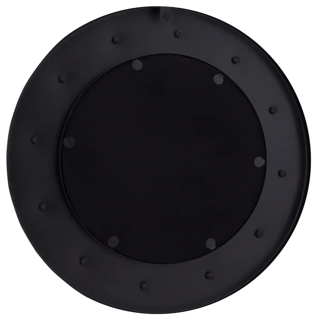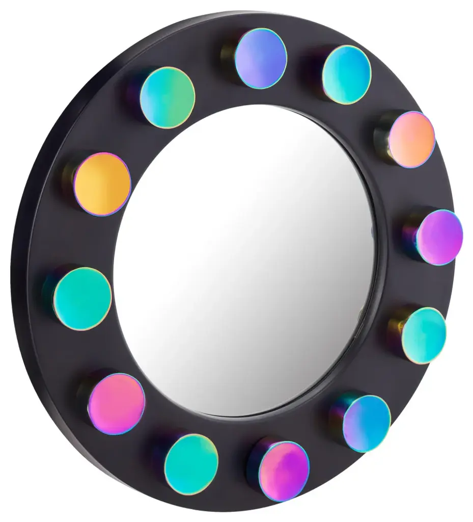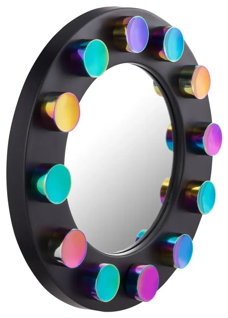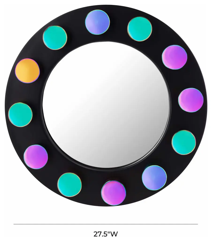 Decorating your space just became a whole lot more exciting! The Rockstar mirror boasts a matte black finish complemented by iridescently colored studs. Whether used alone or with its matching occasional tables, the Rockstar is sure to add stylish flair to your space.• Handmade by skilled furniture craftsmen • Dimensions: 27.5"W x 4"D x 27.5"H• Mirror dimensions: 17.8"DIA• Features colorful accent studs• Made in India