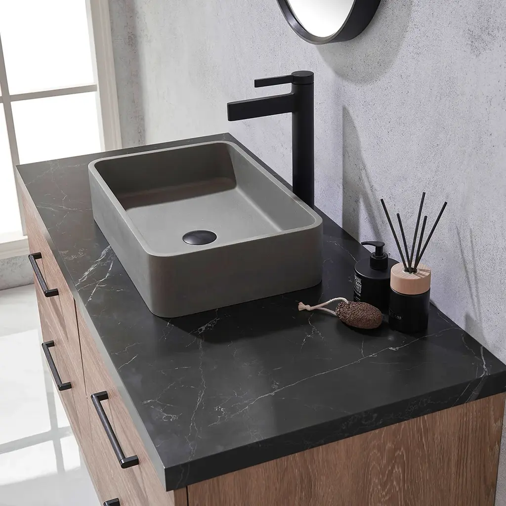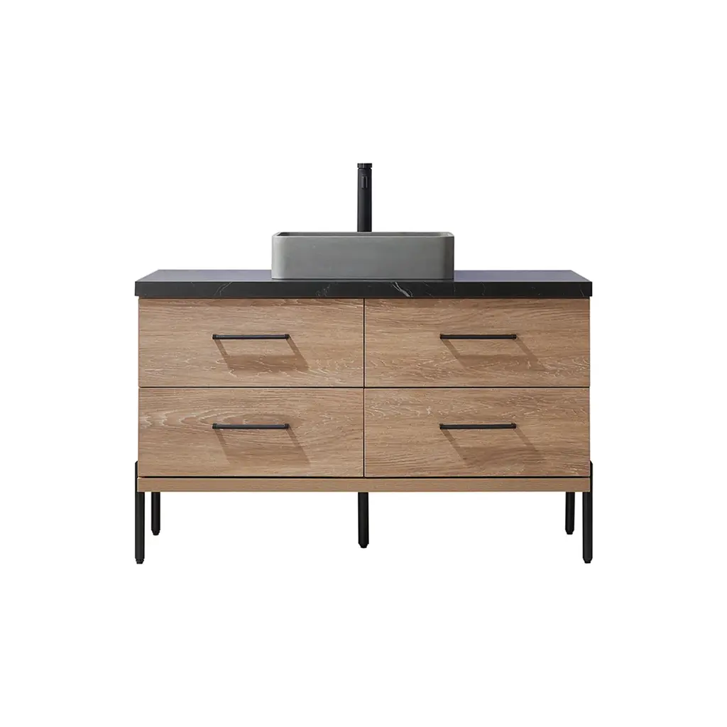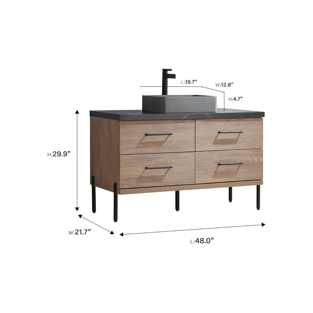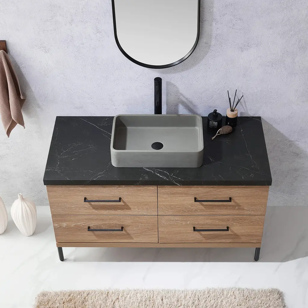 Personalize the look of your vanity with our innovative Trento Series. Featuring an exquisite sintered-stone countertop and concrete vessel sink, this vanity lets you choose the sink style and shape you prefer. You'll love the blend of concrete, marbled stone, and wood textures, which lend warmth and visual interest to this ensemble. Spacious drawers offer seamless concealed storage for all your guest or master bath toiletries.FeaturesFeatures multi-layer technology and moisture-proof board construction to ensure supreme sturdiness.Available in beautiful North American Oak finish to complement any decor.4 soft-closing drawers feature a full-extension glide to maximize your storage space.1.6"-thick, integrated sintered stone in Black offers a clean, elegant look and resists scratches, stains, and cracks.45-degree chamfered water retaining edges lend a unique aesthetic while helping to prevent drips.Customize the look of your vanity by choosing the unique concrete sink style you prefer (4 matching basins to choose from):(9257-BAS-GR(C): Circular Concrete sink(9258-BAS-GR(O): Oval Concrete sink(9260-BAS-GR(R): Circular Concrete sink(9259-BAS-GR(S): Rectangular Concrete sinkMatte Black-finish hardware lends a touch of modern style and bold contrast.Single, oval aluminum frame mirrors complement the vanity and tie it all together. (Mirror Option)Countertop has a pre-drilled, standard 1-3/8" faucet hole for easy plumbing and faucet installation.Freestanding bathroom vanity (without back panel) comes partially assembled for your convenience; Matte Black support feet must be installed.1-Year Manufacturer Warranty--purchase with 100% peace of mind.Does not include faucet, overflow, drain assembly, P-trap and backsplash.Vanity Dimensions:705148C-NO-SL match with Concrete Sink(9257-BAS-GR),Circular shapeCabinet: 47.6"W x 21.6"D x 28.3"HTop: 48"W x 21.7"D x 1.6"HOverall Dimensions: 48"W x 21.7"D x 34.6"HBasin Depth: 4.7"705148O-NO-SL match with Concrete Sink(9258-BAS-GR),Oval shapeCabinet: 47.6"W x 21.6"D x 28.3"HTop: 48"W x 21.7"D x 1.6"HOverall Dimensions: 48"W x 21.7"D x 34.6"HBasin Depth: 4.7"705148R-NO-SL match with Concrete Sink(9260-BAS-GR),Circular shapeCabinet: 47.6"W x 21.6"D x 28.3"HTop: 48"W x 21.7"D x 1.6"HOverall Dimensions: 48"W x 21.7"D x 35.8"HBasin Depth: 5.9"705148S-NO-SL match with Concrete Sink(9259-BAS-GR),Rectangular shapeCabinet: 47.6"W x 21.6"D x 28.3"HTop: 48"W x 21.7"D x 1.6"HOverall Dimensions: 48"W x 21.7"D x 34.6"HBasin Depth: 4.7"All specifications are subject to change without prior notice.