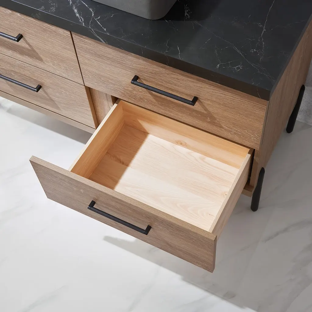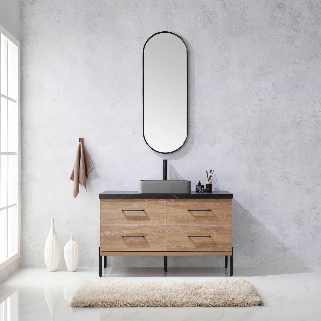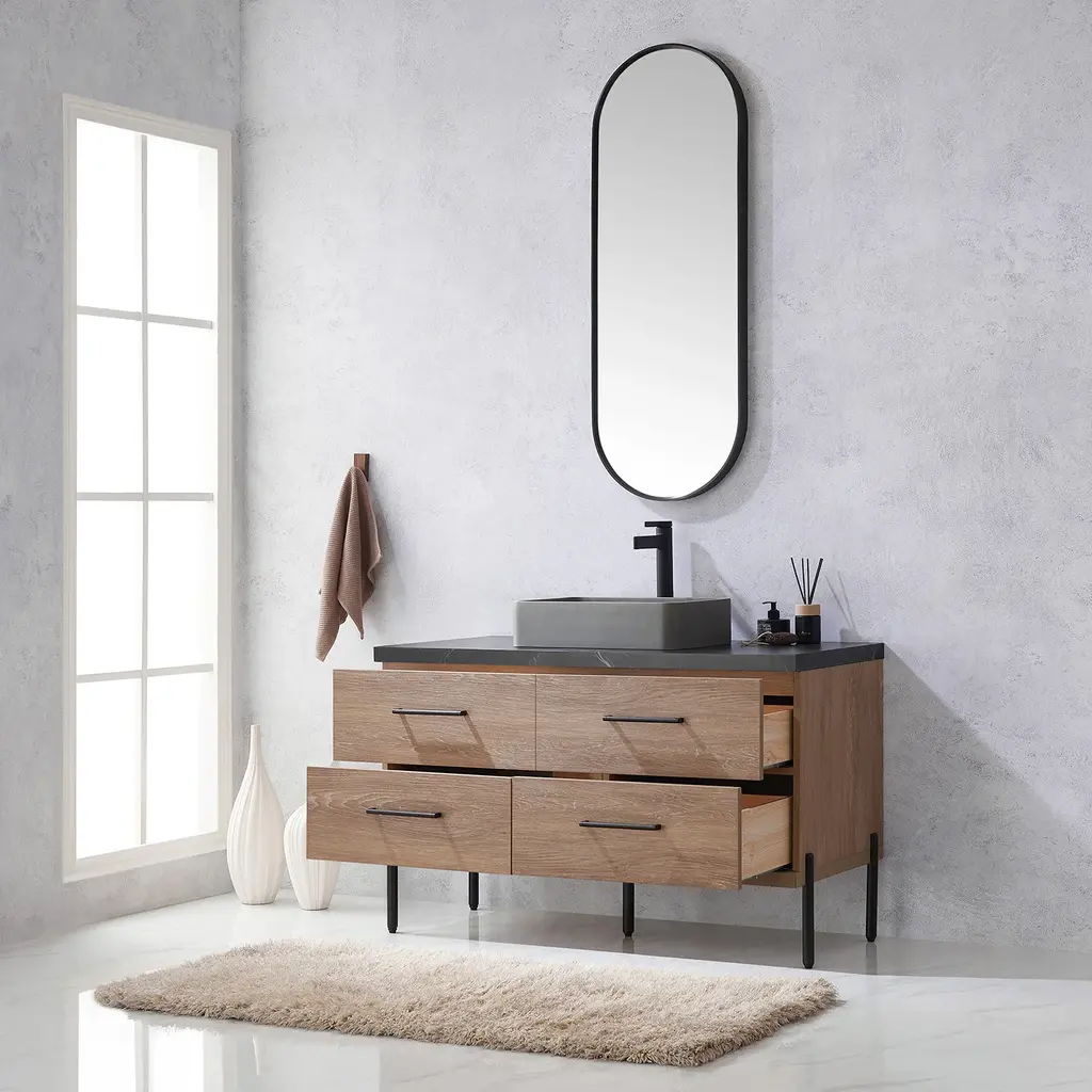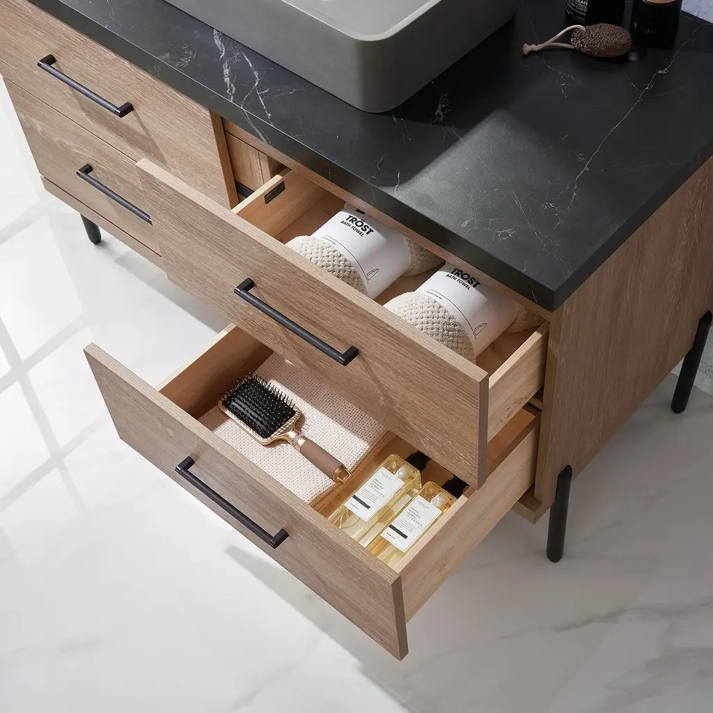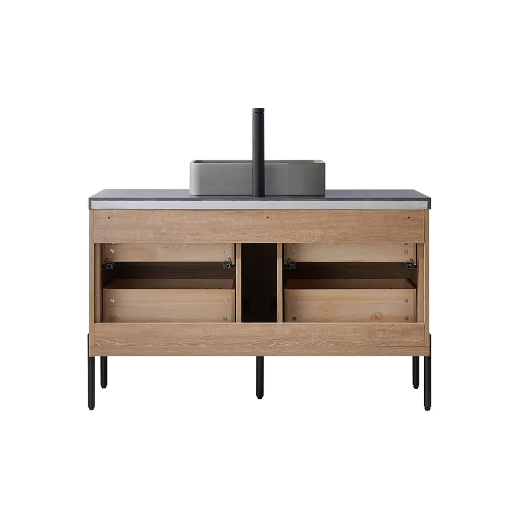 Personalize the look of your vanity with our innovative Trento Series. Featuring an exquisite sintered-stone countertop and concrete vessel sink, this vanity lets you choose the sink style and shape you prefer. You'll love the blend of concrete, marbled stone, and wood textures, which lend warmth and visual interest to this ensemble. Spacious drawers offer seamless concealed storage for all your guest or master bath toiletries.FeaturesFeatures multi-layer technology and moisture-proof board construction to ensure supreme sturdiness.Available in beautiful North American Oak finish to complement any decor.4 soft-closing drawers feature a full-extension glide to maximize your storage space.1.6"-thick, integrated sintered stone in Black offers a clean, elegant look and resists scratches, stains, and cracks.45-degree chamfered water retaining edges lend a unique aesthetic while helping to prevent drips.Customize the look of your vanity by choosing the unique concrete sink style you prefer (4 matching basins to choose from):(9257-BAS-GR(C): Circular Concrete sink(9258-BAS-GR(O): Oval Concrete sink(9260-BAS-GR(R): Circular Concrete sink(9259-BAS-GR(S): Rectangular Concrete sinkMatte Black-finish hardware lends a touch of modern style and bold contrast.Single, oval aluminum frame mirrors complement the vanity and tie it all together. (Mirror Option)Countertop has a pre-drilled, standard 1-3/8" faucet hole for easy plumbing and faucet installation.Freestanding bathroom vanity (without back panel) comes partially assembled for your convenience; Matte Black support feet must be installed.1-Year Manufacturer Warranty--purchase with 100% peace of mind.Does not include faucet, overflow, drain assembly, P-trap and backsplash.Vanity Dimensions:705148C-NO-SL match with Concrete Sink(9257-BAS-GR),Circular shapeCabinet: 47.6"W x 21.6"D x 28.3"HTop: 48"W x 21.7"D x 1.6"HOverall Dimensions: 48"W x 21.7"D x 34.6"HBasin Depth: 4.7"705148O-NO-SL match with Concrete Sink(9258-BAS-GR),Oval shapeCabinet: 47.6"W x 21.6"D x 28.3"HTop: 48"W x 21.7"D x 1.6"HOverall Dimensions: 48"W x 21.7"D x 34.6"HBasin Depth: 4.7"705148R-NO-SL match with Concrete Sink(9260-BAS-GR),Circular shapeCabinet: 47.6"W x 21.6"D x 28.3"HTop: 48"W x 21.7"D x 1.6"HOverall Dimensions: 48"W x 21.7"D x 35.8"HBasin Depth: 5.9"705148S-NO-SL match with Concrete Sink(9259-BAS-GR),Rectangular shapeCabinet: 47.6"W x 21.6"D x 28.3"HTop: 48"W x 21.7"D x 1.6"HOverall Dimensions: 48"W x 21.7"D x 34.6"HBasin Depth: 4.7"All specifications are subject to change without prior notice.