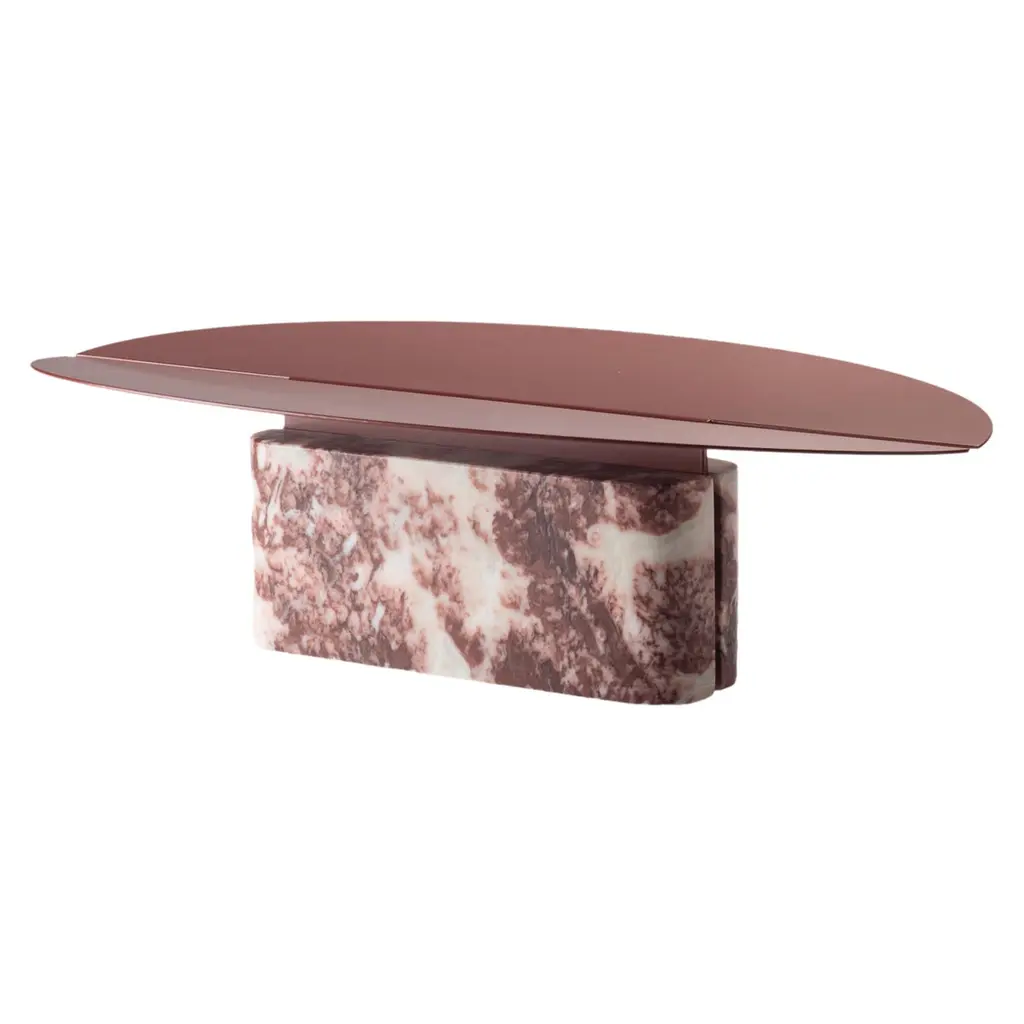 Clean and elegant lines define this gorgeous table mirror, part of a series of small mirrors and a photo holder designed by Superstudio to transform industrial scraps into sophisticated objects of design. Resting on a masterfully and beautifully milled Red Francia marble base, it features a thin, round mirror sheet enhancing the refined and essential character of this piece.