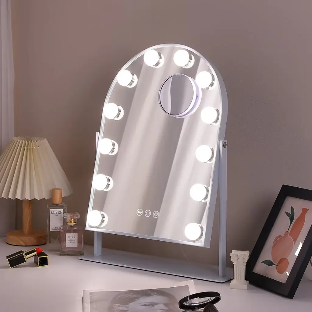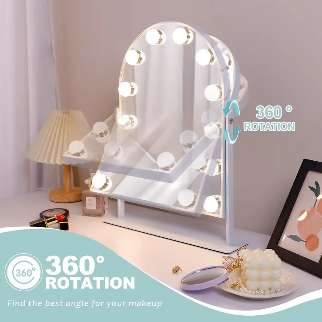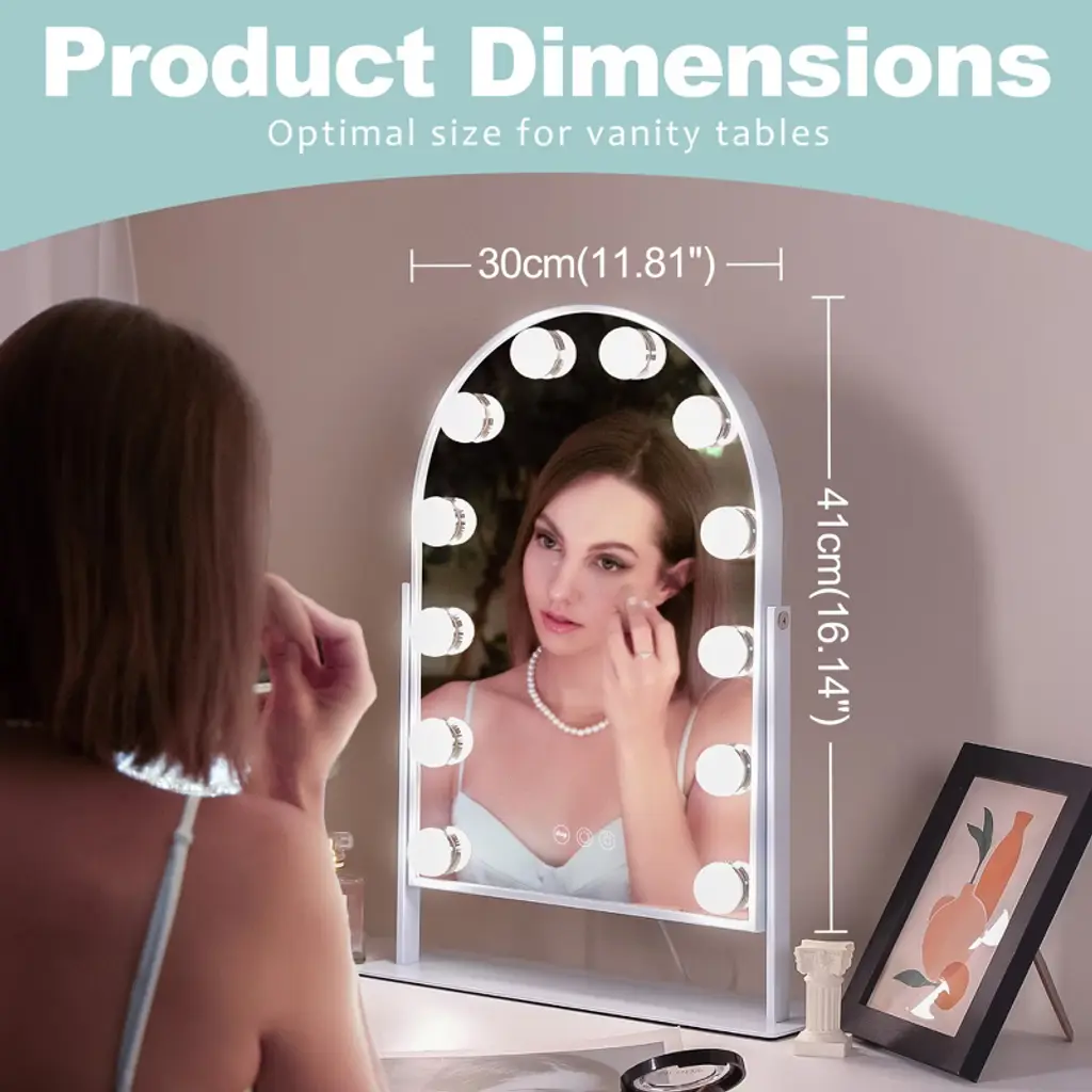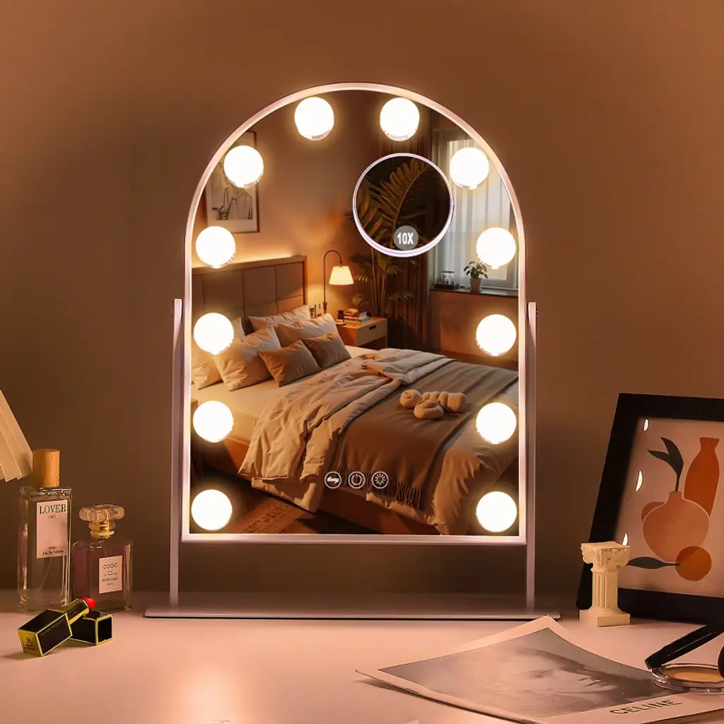 Elegant Arched Design The unique arched shape adds sophistication while providing a wider, more immersive reflection for effortless makeup application. 360° Free Rotation Adjust the Vanity Mirror to any angle with full 360° rotation, ensuring the best lighting and viewing position from every perspective. Perfect Size & Easy Assembly 14.37'' x 3.14'' x 18.5'', this Makeup Mirror is compact yet spacious, fitting perfectly on any vanity. Quick assembly makes it hassle-free to set up and use. 10X Magnification for Precision Includes a detachable 10X magnification mini mirror, perfect for detailed makeup, eyebrow shaping, and skincare. Adjustable Brightness & 3 Light Settings Choose from cool, warm, or natural light, with adjustable brightness for perfect illumination in any setting. A Thoughtful Gift for Makeup Lovers An ideal holiday or birthday gift for daughters, granddaughters, and loved ones, combining elegance and practicality.