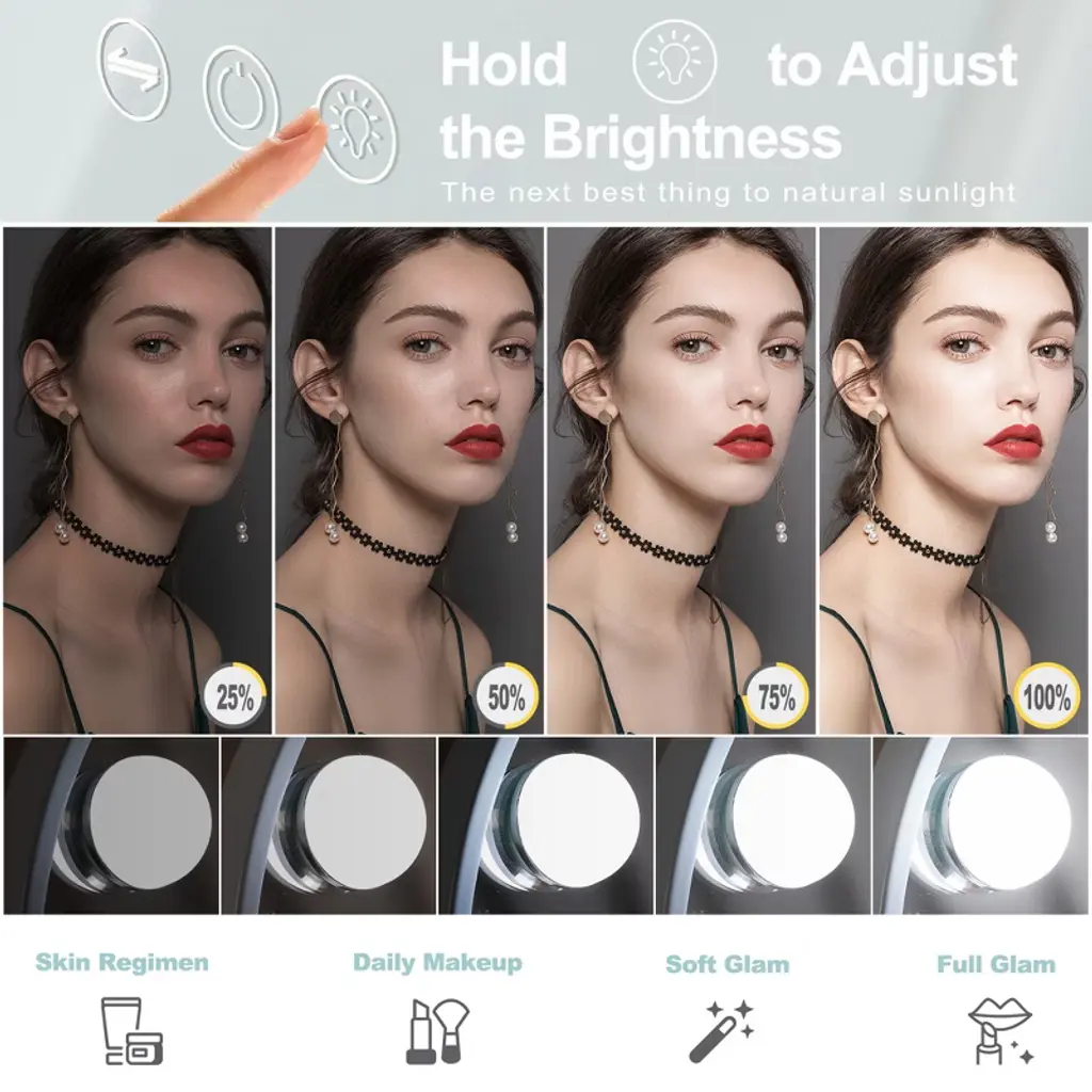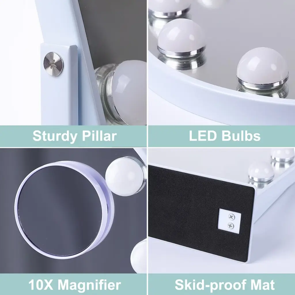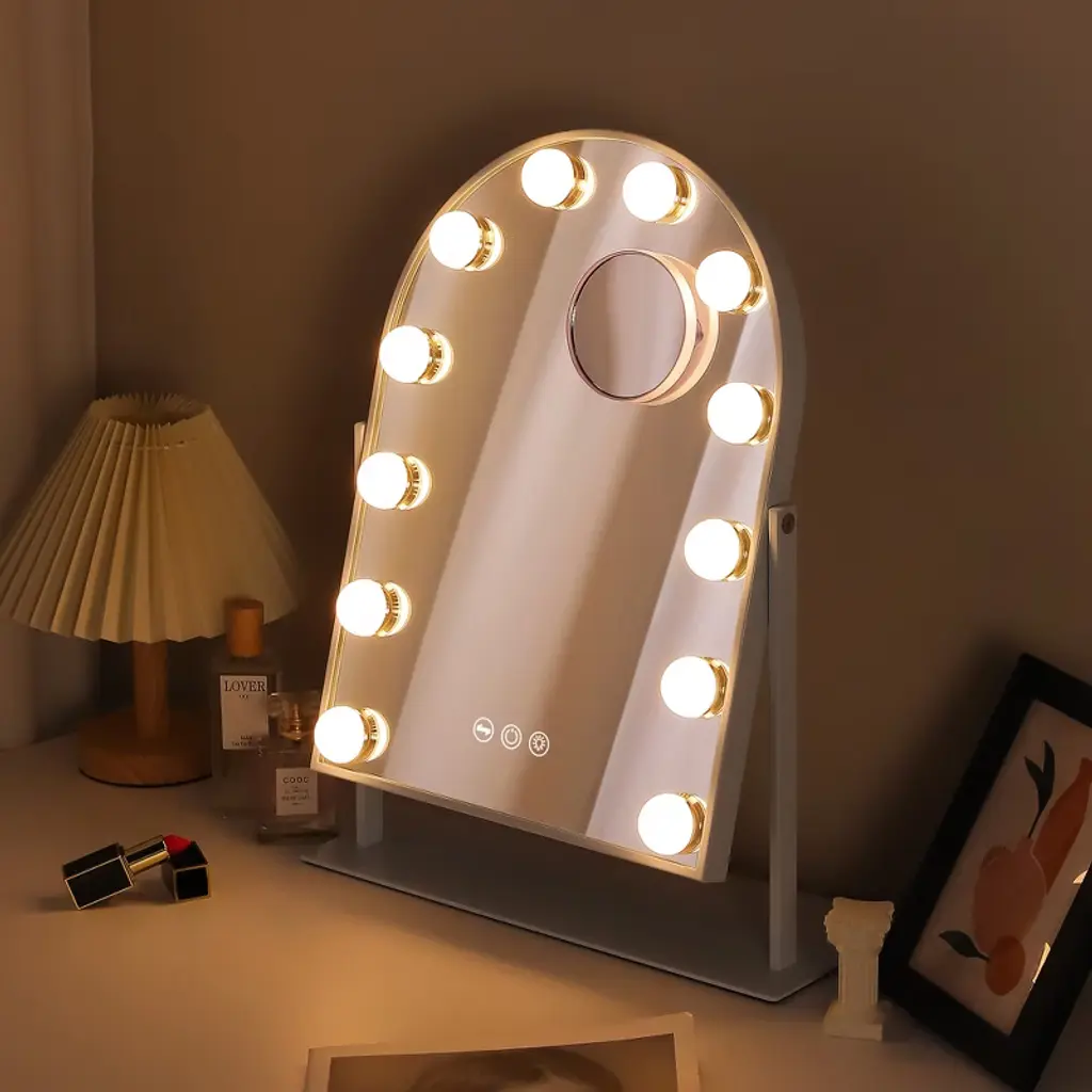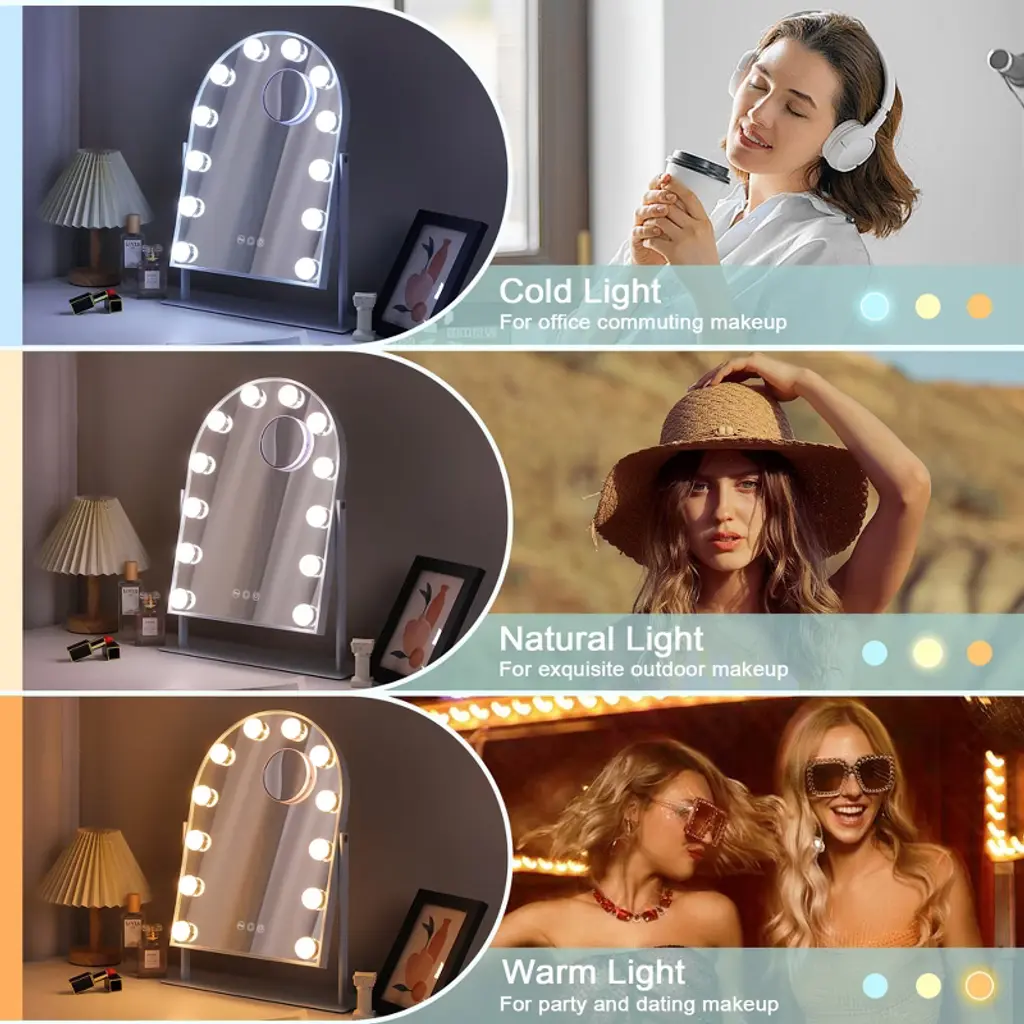 Elegant Arched Design The unique arched shape adds sophistication while providing a wider, more immersive reflection for effortless makeup application. 360° Free Rotation Adjust the Vanity Mirror to any angle with full 360° rotation, ensuring the best lighting and viewing position from every perspective. Perfect Size & Easy Assembly 14.37'' x 3.14'' x 18.5'', this Makeup Mirror is compact yet spacious, fitting perfectly on any vanity. Quick assembly makes it hassle-free to set up and use. 10X Magnification for Precision Includes a detachable 10X magnification mini mirror, perfect for detailed makeup, eyebrow shaping, and skincare. Adjustable Brightness & 3 Light Settings Choose from cool, warm, or natural light, with adjustable brightness for perfect illumination in any setting. A Thoughtful Gift for Makeup Lovers An ideal holiday or birthday gift for daughters, granddaughters, and loved ones, combining elegance and practicality.