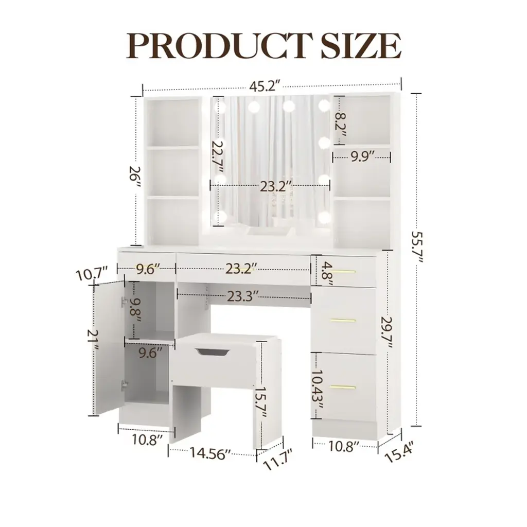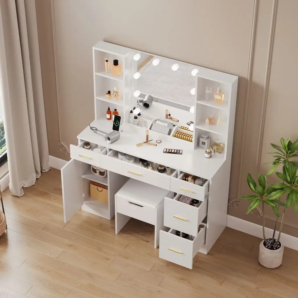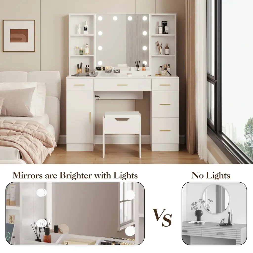 Vanity Desk with Led Lighted Mirror,Makeup Vanity with 10 Led Lights & 5 Metal Sliding Drawers, 3 Color Brightness Adjustable, Vanity Table with 6 Open Shelves, Dressing Table for Women Girls