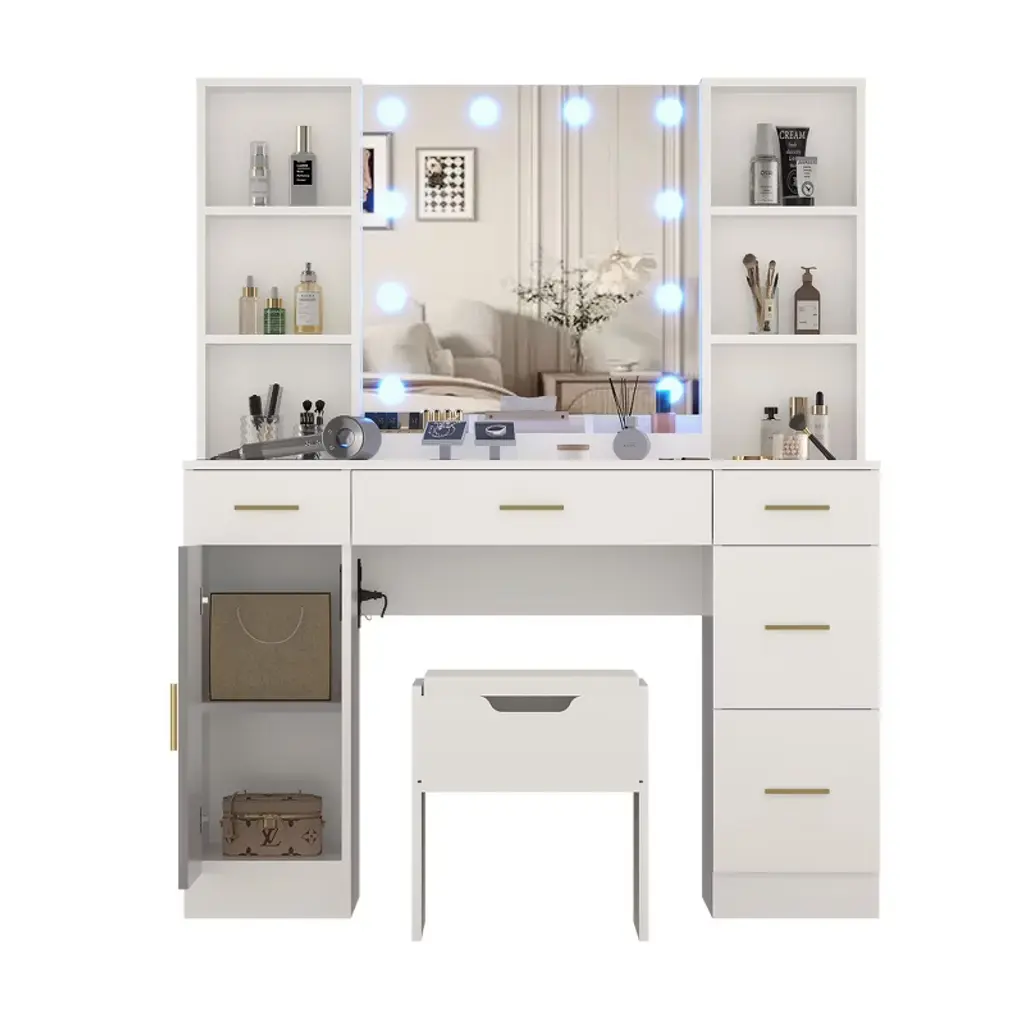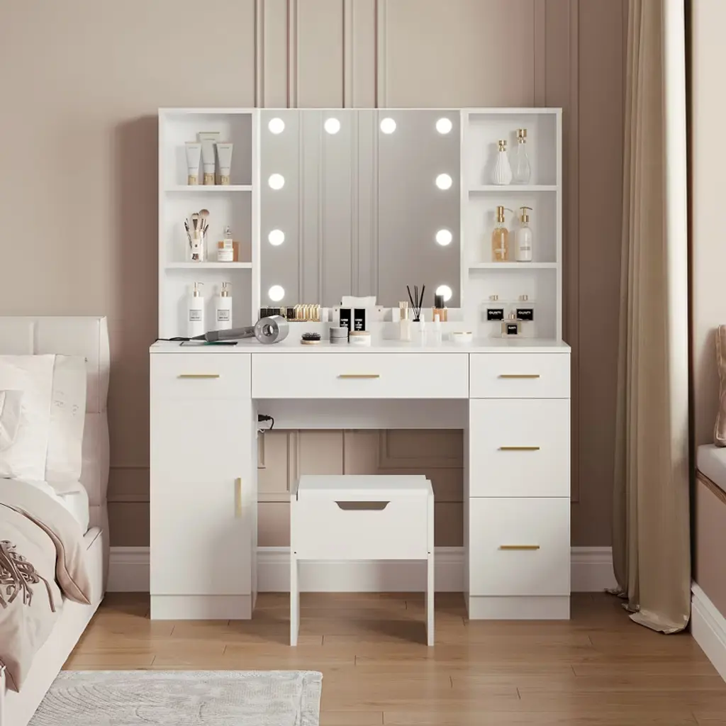 Vanity Desk With Mirror, Makeup Vanity Table With Led Light, 5 Sliding Drawers, Vanity Table With 6 Open Shelves, Makeup Dressing Table For Women