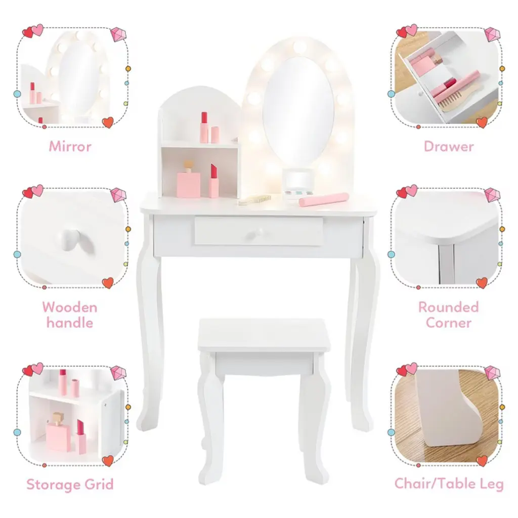 Vanity Set With Led Lights & Mirror - White Wooden Makeup Desk & Stool, Toddler Dressing Table With 2-tier Storage & Play Accessories (Ages 3-8)
