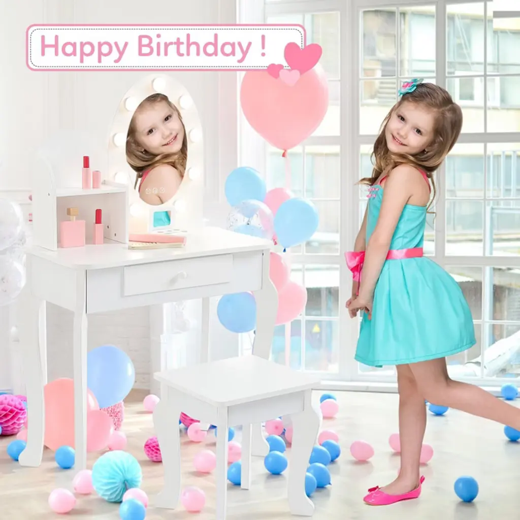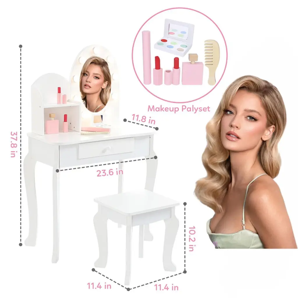 Complete Vanity Experience: The small vanity set includes a 23.6x11.8x37.8-inch table and stool, providing an ideal space for little princesses to play and explore their creativity. The lighted round mirror adds a magical touch to their dressing routine Unleash Imagination: The kids vanity set includes a 6-piece play makeup kit with pretend lipstick, an eyeshadow palette, a comb, and more. It fosters imaginative play, helping children develop skills while having fun and feeling glamorous Ample Storage: This makeup vanity is designed for practicality, featuring a large drawer and two open shelves on the tabletop for storing makeup accessories, hair tools, and other items. It makes organization easy and encourages tidy play Sturdy and Safe: Crafted from thick engineered wood, this toddler vanity is waterproof and scratch-resistant, ensuring it withstands the adventures of playtime. Parents can have peace of mind knowing the vanity is built for durability and safety Easy Assembly: With clearly labeled parts and straightforward instructions, assembling this vanity set is a breeze. Spend less time on setup and more time enjoying creative moments with your little ones, making each play session special