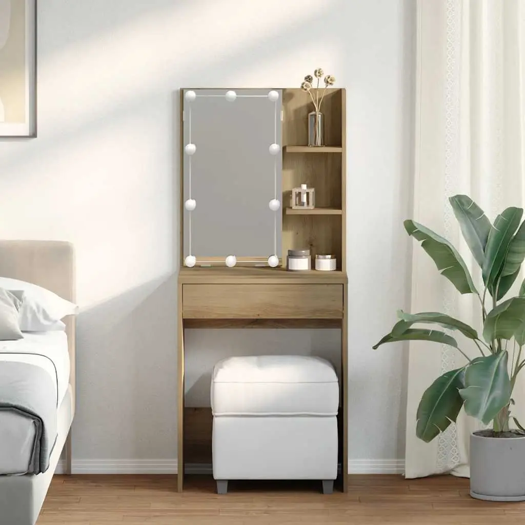 This dressing table combines elegance with practicality, making it a fab addition to any bedroom. The stunning artisan oak finish and built-in LED lighting create a warm, inviting space that's perfect for your grooming and makeup. Elegant Lighting: The built-in RGB LED lights not only brighten your area but also let you customize them. This ensures you have the best lighting for grooming, making everything clearer while you get ready.Spacious Storage: With a roomy drawer and two shelves, this dressing table keeps your makeup and accessories sorted. A neat space makes your routine easier so you can focus on what matters most.Modern Design: The sleek, rectangular look and matte finish fit perfectly in modern bedrooms. Its simple yet stylish design adds value to your room.Durable Material: Made from high-quality engineered wood, this dressing table is built to last. The surface is smooth and resistant to moisture and stains, making it ideal for everyday use while looking great too.Versatile Use: Great for all ages looking to step up their makeup game, this vanity table is perfect for casual use or special occasions, enhancing your grooming experience.