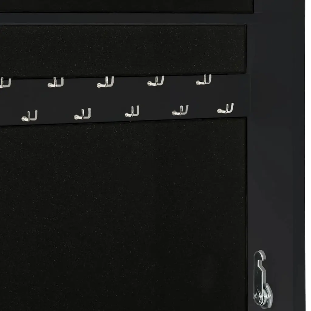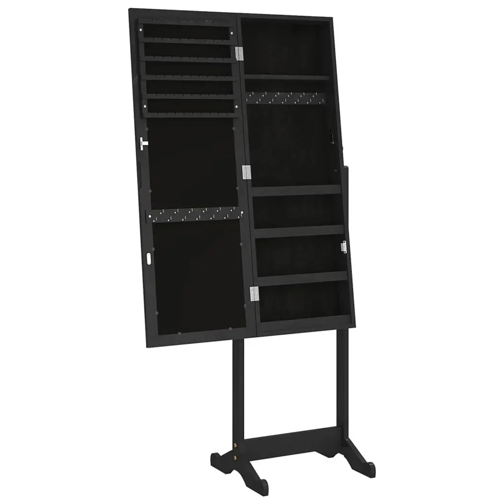 This Free Standing Black Mirror Jewelry Cabinet is a fantastic touch for any bedroom or dressing room, blending style and function. With its sleek black finish and modern design, it’s not just a handy storage solution but also adds a bit of flair to your space, making it easy to keep your cherished jewelry organized and accessible. Strong build with engineered wood means it lasts, making it a great fixture in your home. The smooth surface adds to its style while the black finish gives it a classy, timeless vibe.Five shelves provide plenty of room for necklaces, earrings, and other bits, helping you arrange your jewelry for easy grabs.The adjustable mirror comes in handy, letting you set the height to suit you, which makes it comfy for all users.This cabinet has a solid deadbolt lock, giving you peace of mind that your prized possessions are safe when it’s not in use.The rotatable mirror lets you check your outfit from all angles without a fuss, so you always look spot on before heading out.