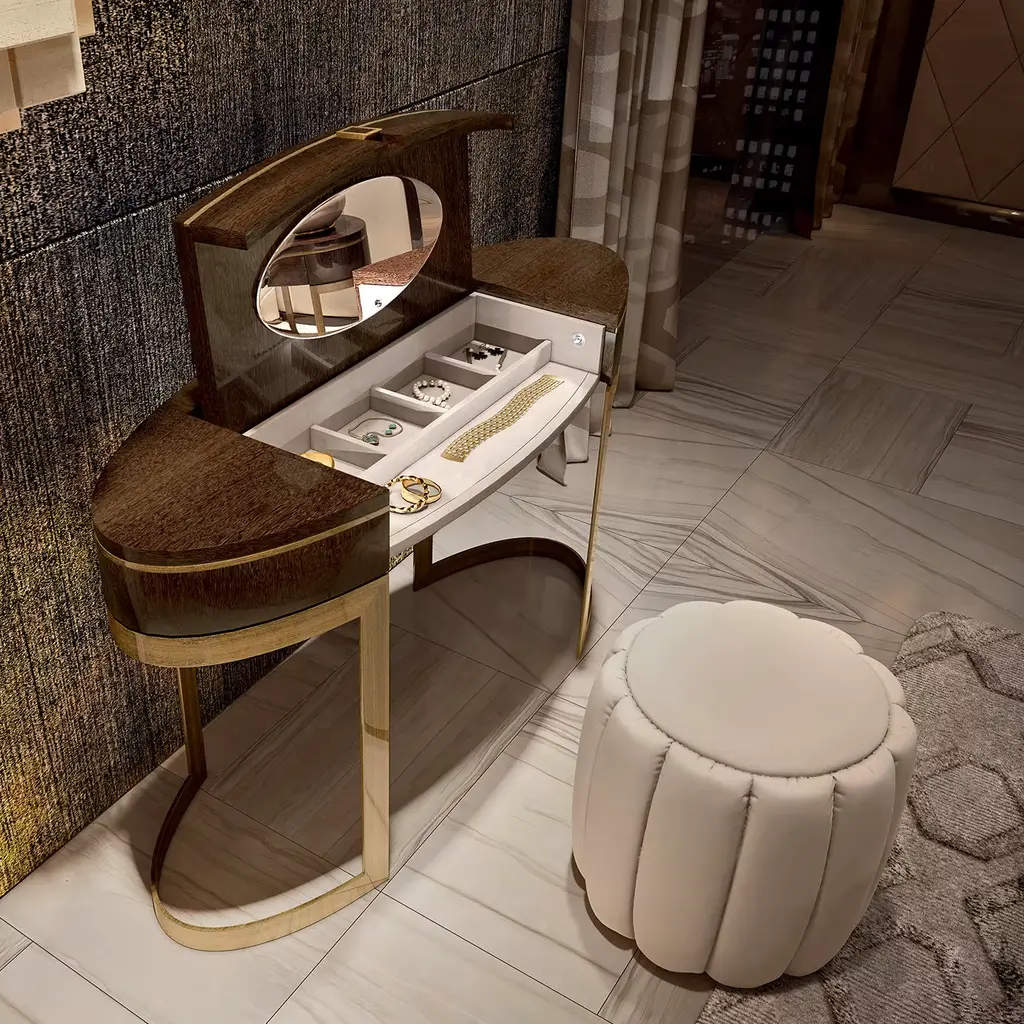 Pampering, grooming or applying and removing makeup can become all that that more elegant when done in front of this gorgeous wooden vanity table. The table rests on a brushed bronze, rounded structure, while an integrated round mirror and a drawer make this piece practical yet beautiful to look at. A perfect addition for any bedroom.