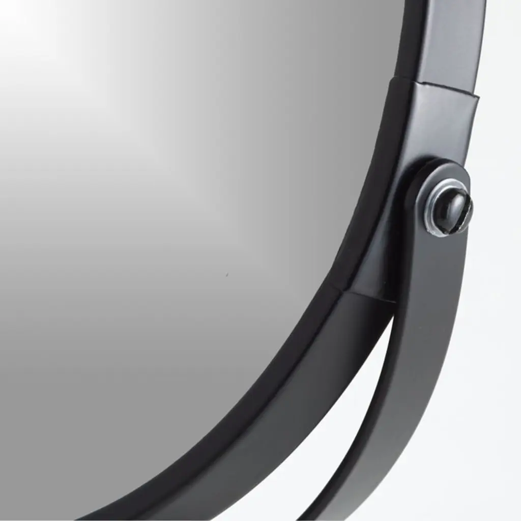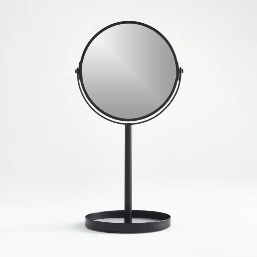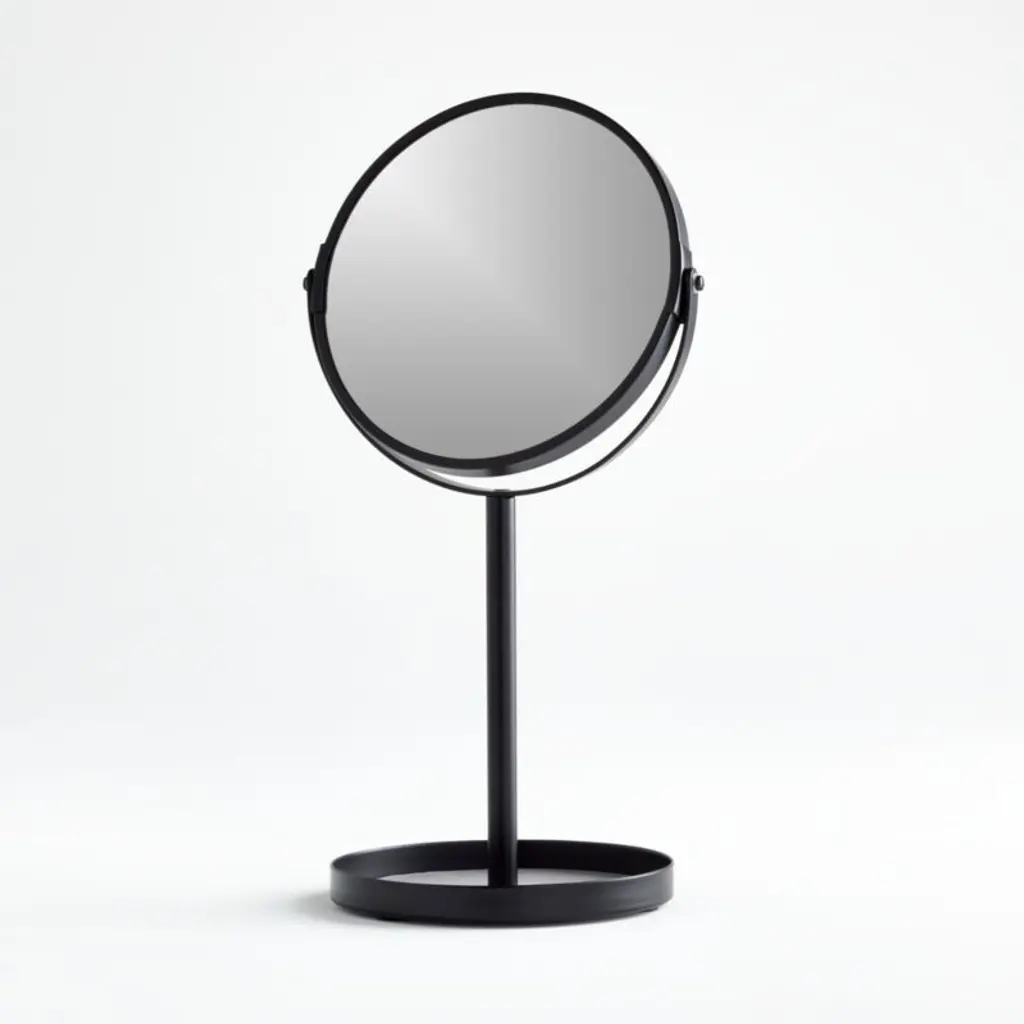 This black table mirror parks neatly on a bathroom vanity or countertop for everyday grooming. Made of black-finished steel, the stand features a round mirror that rotates 360 degrees and flips sides from 1x to 3x magnification. A tray at the bottom corrals small toiletries, hair clips and elastic bands.Yamazaki of Japan has been designing thoughtful and innovative home goods for over a century.