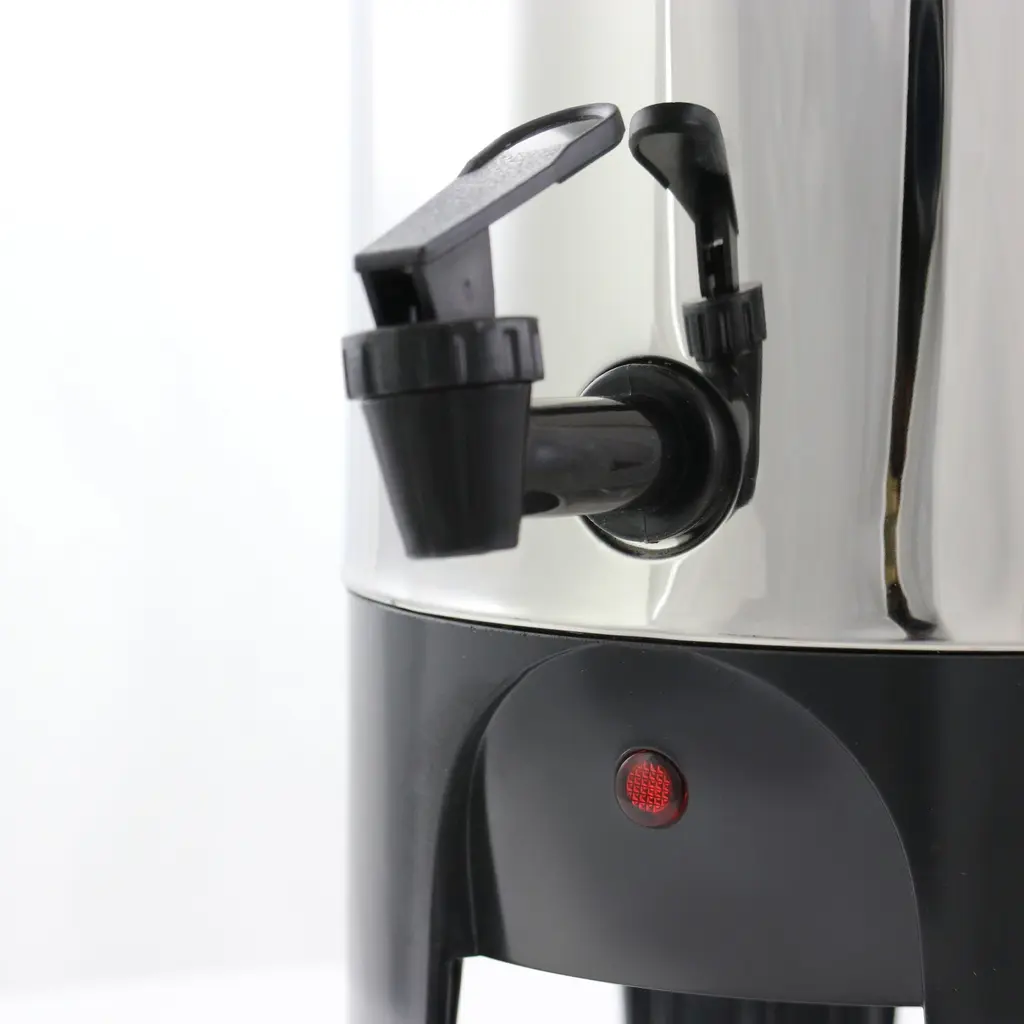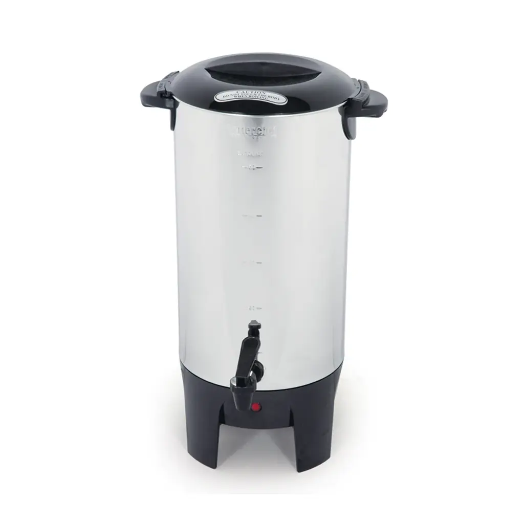 The Better Chef 10-50 Cup Coffeemaker features a stainless-steel construction for fresher tasting coffee and easier cleanup. Makes coffee, tea, hot water for hot cocoa for parties and events. The non-drip spigot ensures for mess free serving to your guests. With the twist-to-lock cover you can be sure that the hot contents will stay put. Item Dimensions: 11.00" x 10.00" x 13.00"Item Weight: 3.20lbs