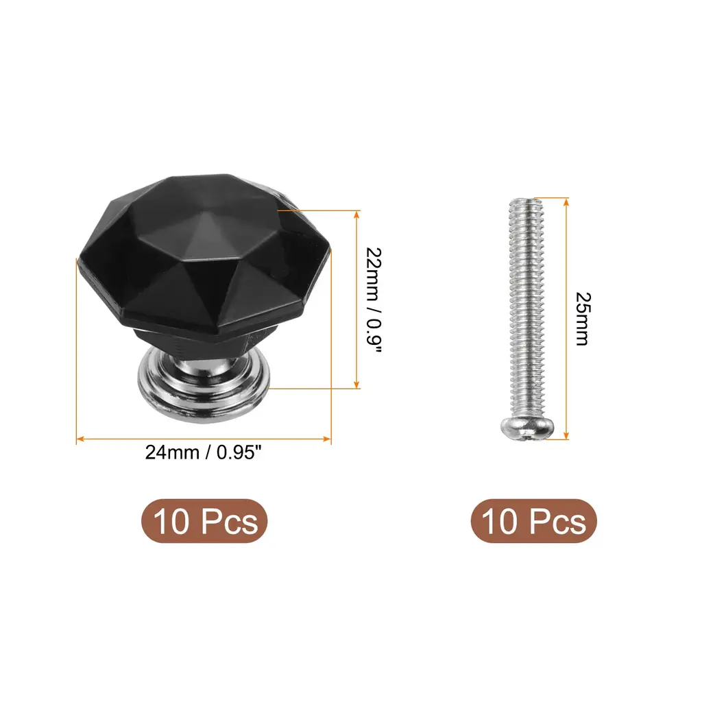 Descriptions:Acrylic and Metal Construction: The knobs are made from acrylic and zinc alloy material, not easy to fade, or rust, and are easy to clean, combining the elegance of crystal with the durability of metal, providing a long-lasting decorative element for furniture.Decorative and Functional: These drawer knobs not only serve a functional purpose by making it easier to open and close drawers but also have a crystal-like appearance that adds a touch of sophistication to any piece of furniture.Easy Installation: To install, screw the knobs into the pre-drilled holes on the drawers or closet doors, no special tools are typically required.Versatile Use: Great for use in various rooms such as bedrooms, bathrooms, and kitchens, these knobs can be used on dressers, wardrobes, cupboards, and closets to enhance the aesthetic appeal of the space.Careful Handling: When installing, ensure that the surfaces are clean and the holes are accurately drilled to prevent any damage to the knobs or the furniture. Specifications:Material: Acrylic, Zinc AlloyColor: Clear/SilverTotal Size: 24 x 22 mm / 0.95 x 0.9 inch (W*H)Screw Size: M4 x 25 mmPackage Contents:10 pcs x Knobs10 pcs x Screws
