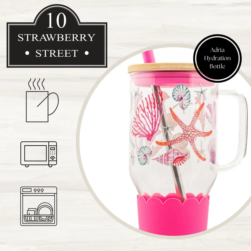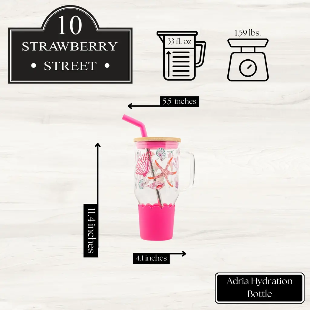 Stay refreshed and stylish with the Adria Hydration Bottle, designed for convenience and everyday hydration. Whether you're a busy parent, fitness enthusiast, or always on the go, this large-capacity bottle ensures you stay hydrated throughout the day.With a 33 fl oz capacity, it’s perfect for carrying water, coffee, or your favorite beverage. Crafted from durable borosilicate glass, it resists temperature changes, ensuring longevity and reliability. The sleek, tapered bottom fits effortlessly into most cup holders, making it ideal for travel or commuting.Available in a variety of vibrant spring colors and patterns, this bottle adds a fresh, stylish touch to your routine. It also comes with a bamboo lid and a stainless steel straw with a silicone stopper, providing a sustainable and eco-friendly drinking experience.Upgrade your hydration game with the Adria Hydration Bottle—where functionality meets fashion.