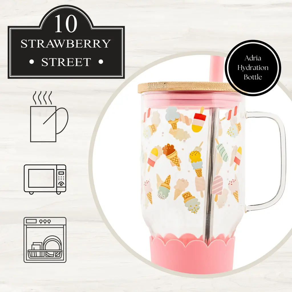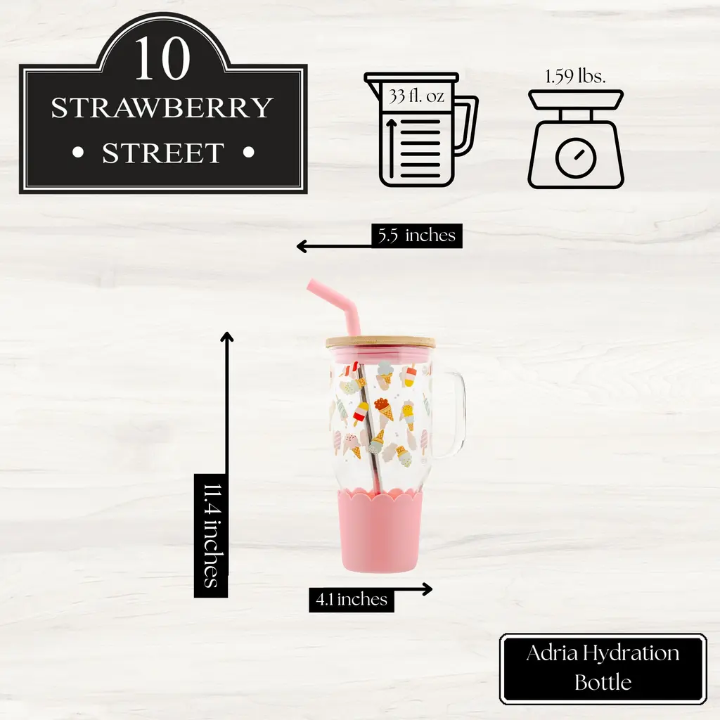 Stay refreshed and stylish with the Adria Hydration Bottle, designed for convenience and everyday hydration. Whether you're a busy parent, fitness enthusiast, or always on the go, this large-capacity bottle ensures you stay hydrated throughout the day.With a 33 fl oz capacity, it’s perfect for carrying water, coffee, or your favorite beverage. Crafted from durable borosilicate glass, it resists temperature changes, ensuring longevity and reliability. The sleek, tapered bottom fits effortlessly into most cup holders, making it ideal for travel or commuting.Available in a variety of vibrant spring colors and patterns, this bottle adds a fresh, stylish touch to your routine. It also comes with a bamboo lid and a stainless steel straw with a silicone stopper, providing a sustainable and eco-friendly drinking experience.Upgrade your hydration game with the Adria Hydration Bottle—where functionality meets fashion.