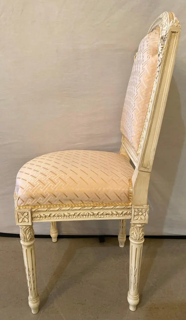 10 Swedish Louis XVI style dining / side chairs painted carved frames in a salmon satin new fabricThis stunning set of 10 dining chairs have been fully refinished and each are done in a fine new fabric. Each having a tapering carved group of legs leading to a carved apron supporting a overstuffed and very comfortable seat. The square back rest being finely carved with an dome top flanked by carved floral and leaf terminals. Can purchase as many as are needed six eight or all ten. We can not sell one or two chairs.