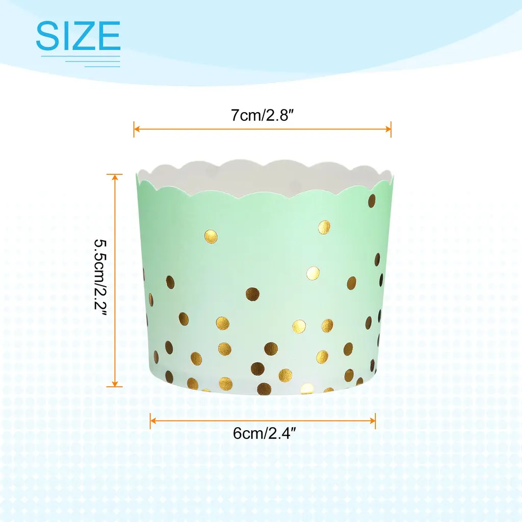 Paper baking cups are made of wood pulp and PE coating, sturdy and durable, can maintain a good shape during baking, provide support for cupcakes or muffins, and the outside remains bright and shiny when baking food.The cupcake liners are designed to be oven safe and withstand temperatures up to 220℃/420℉ and are also suitable for microwaves and freezer. It is perfect for different parties, birthdays, celebrations, baby-showers, weddings, Christmas, Halloween or Thanksgiving decorations, etc.With cute pattern and look elegant, cupcake wrappers are suitable for serving cakes, cookies, muffins, candies, nuts, pastries, ice cream and other treats, which can make your desserts, cookies and pastries more attractive and impressive.No baking pan or muffins pan required with these cupcake liners, just pour the batter into the cups, place on the baking pan, and bake and you can enjoy the delicious taste.