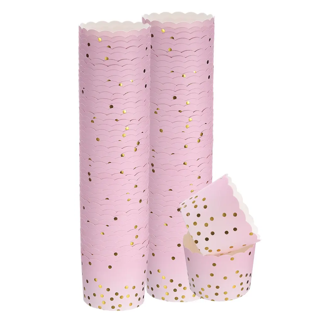 Paper baking cups are made of wood pulp and PE coating, sturdy and durable, can maintain a good shape during baking, provide support for cupcakes or muffins, and the outside remains bright and shiny when baking food.The cupcake liners are designed to be oven safe and withstand temperatures up to 220℃/420℉ and are also suitable for microwaves and freezer. It is perfect for different parties, birthdays, celebrations, baby-showers, weddings, Christmas, Halloween or Thanksgiving decorations, etc.With cute pattern and look elegant, cupcake wrappers are suitable for serving cakes, cookies, muffins, candies, nuts, pastries, ice cream and other treats, which can make your desserts, cookies and pastries more attractive and impressive.No baking pan or muffins pan required with these cupcake liners, just pour the batter into the cups, place on the baking pan, and bake and you can enjoy the delicious taste.