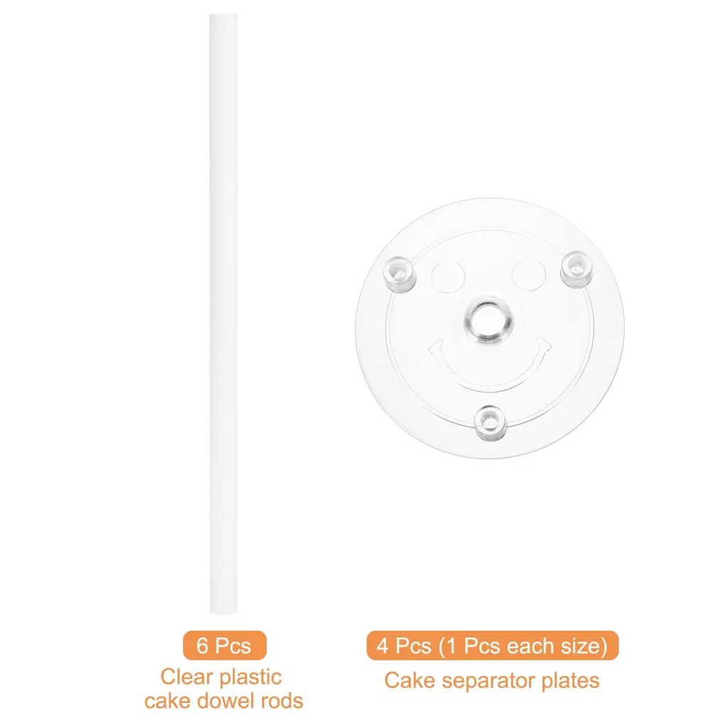 Description:1.Material: Cake Sticks Support Rods and Cake Separator Plates are made of plastic materials with smooth surface. It can stand wear and tear, not easy to fray, durable for using a long time.2.Details of Cake Dowel Rods are thicker and sturdy to hold your tiered cakes, to make your cake stably stand with a beautiful state, and you can also cut the rods into different length according to actual need.Easy To Use: Cake Dowel pushed into tiers as dowel rods, these plastic dowel rods fit onto most white separator plates except tall tier. Cake Board make it sturdy to hold your tiered cake, keeping it in a steady state.5.Wide Applications: cake dowels rods set can help you to hold the cake and separate cake easily, adding more charm to your cake. for cupcakes, cookies,, desserts, snacks,, pies, cakes, and more! Great for wedding, engagement,, Christmas, and any other theme parties.Specification:Name: Cake dowelsMaterial: PlasticColor: ClearSize: Plates: approx. 12 cm, Diameter:rod: approx. 24 cm/ 9.4 inch in lengthApplicable scenes: Home baking/ party wedding holiday party stacking cake makingPackage Contents: 6 x Clear plastic cake dowel rods,4 x Cake separator plates
