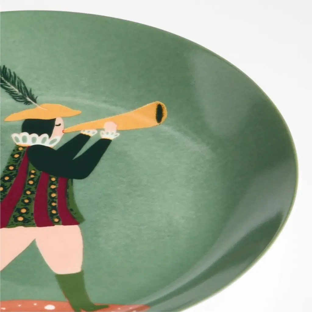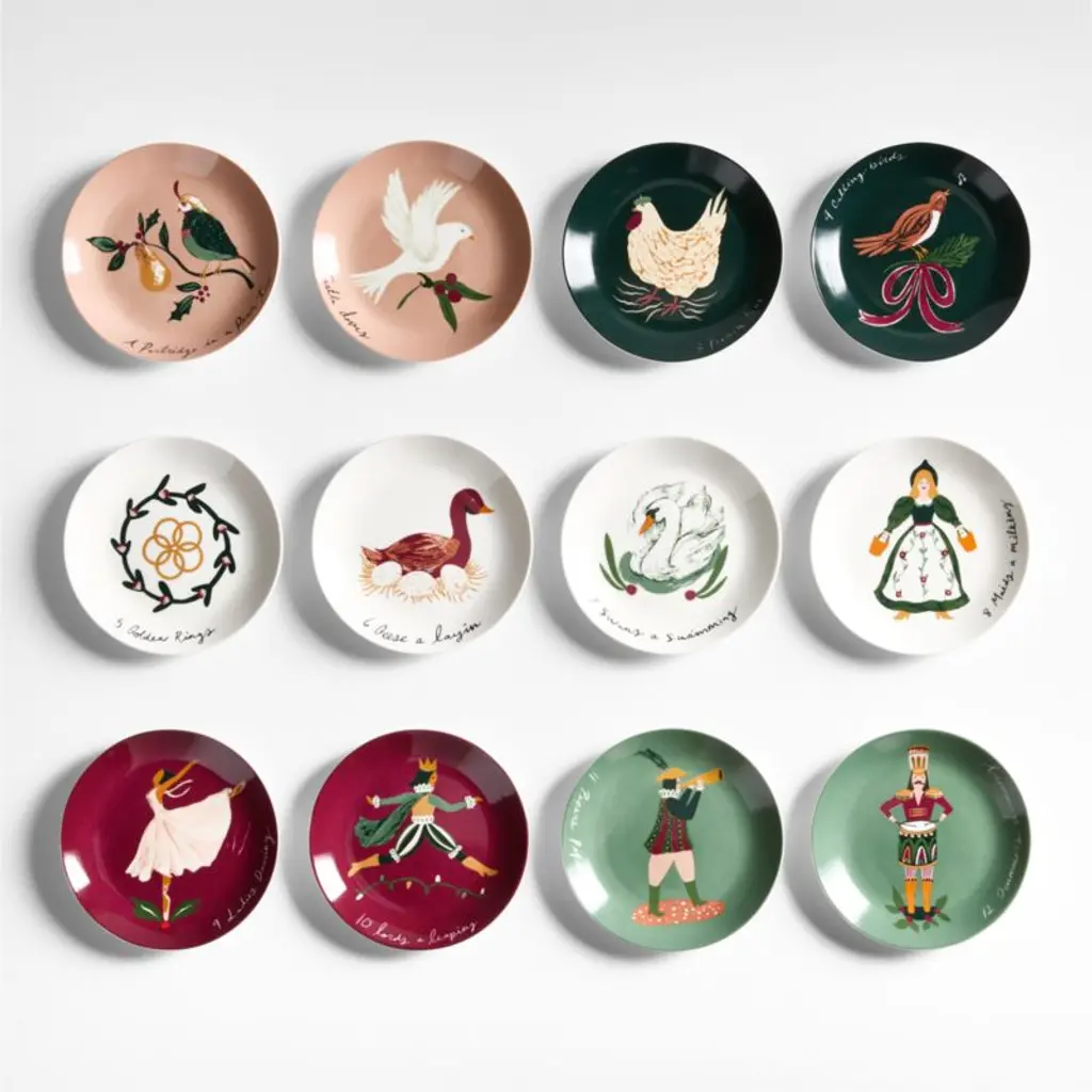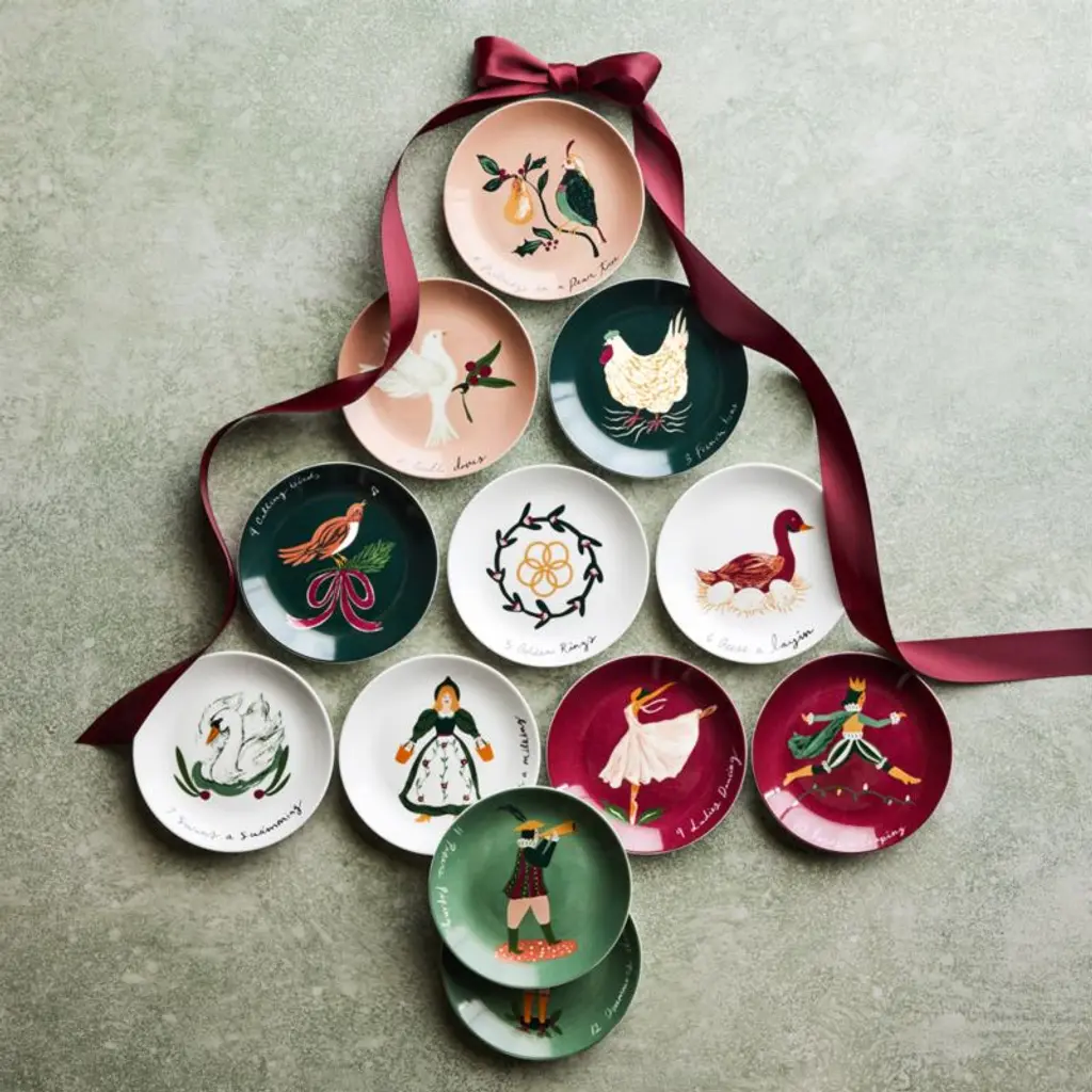From the lone partridge to the dozen drummers, each plate in this festive set depicts one of the 12 gifts described in the popular Christmas carol. Hand-drawn figures with scripted captions resemble fairytale illustrations, lending a bit of whimsy and a pop of color to holiday entertaining. Stacked in a chrome metal stand with a handle, the stoneware plates can be used throughout the holidays. Use our exclusive plates for Christmas dinner side dishes, Christmas morning sweets or New Year's Eve appetizers.