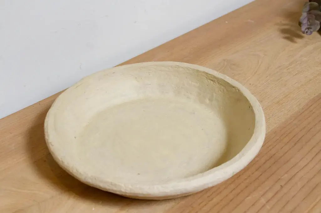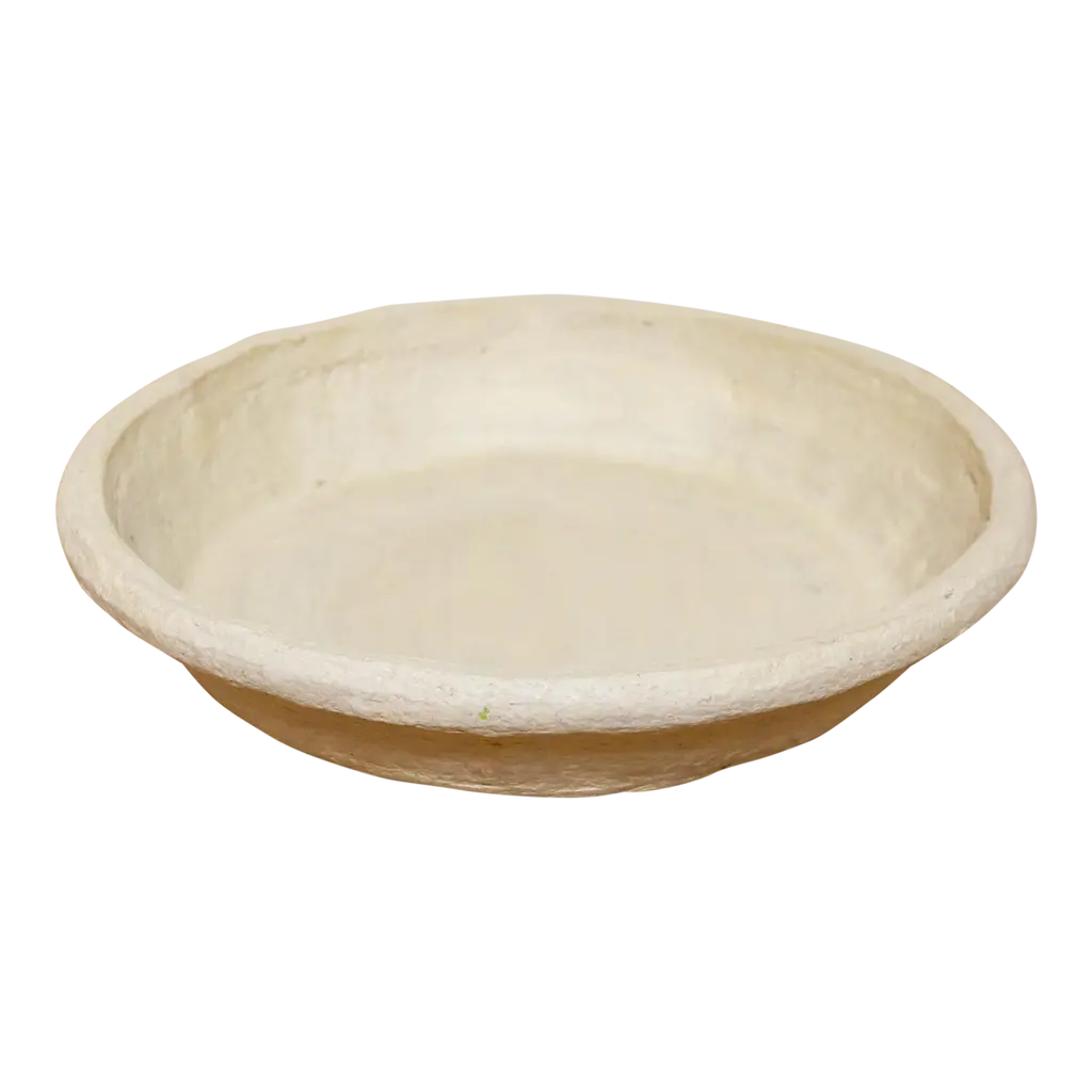 A lovely handmade from papier-mache for a touch of rustic charm, this handcrafted aged white round plate boasts surprising durability and a lightweight design. Despite its delicate appearance, it's perfect for holding keys, remotes, or simply adding a decorative touch to your tabletop. This charming round plate is artisanal in nature with a unique textured finish, embracing imperfections for a one-of-a-kind look. **Please bear in mind that colors of products shown may vary slightly from their original color due to monitor display settings or photography studio lighting.