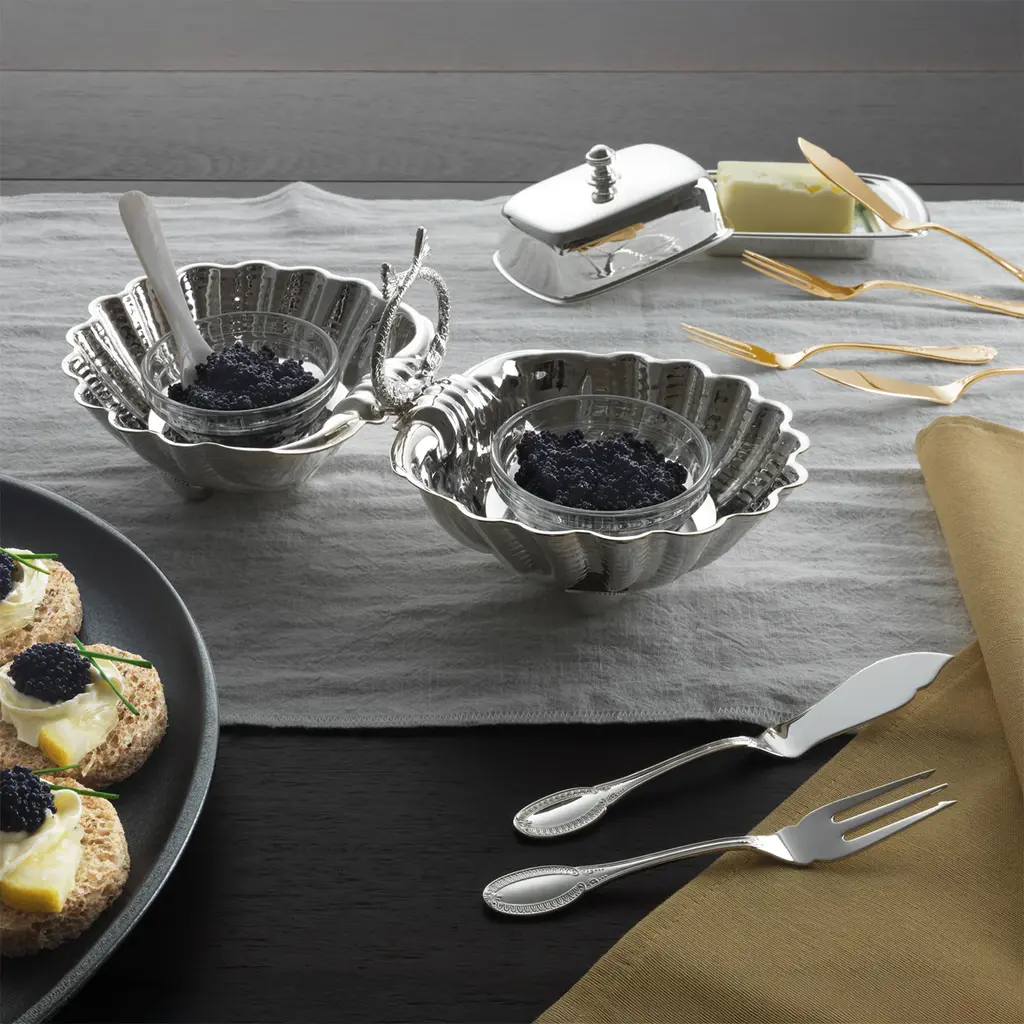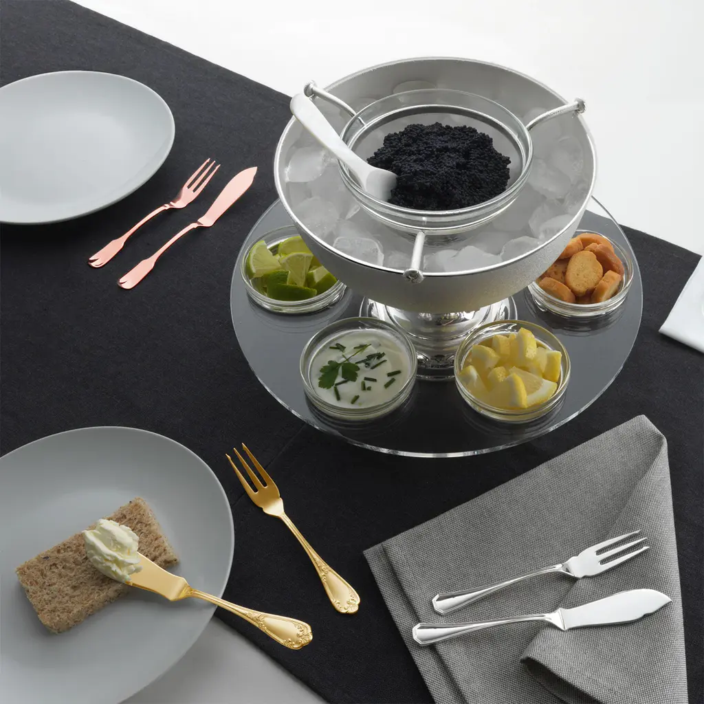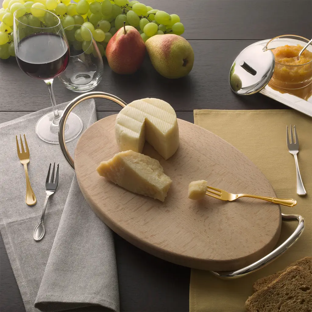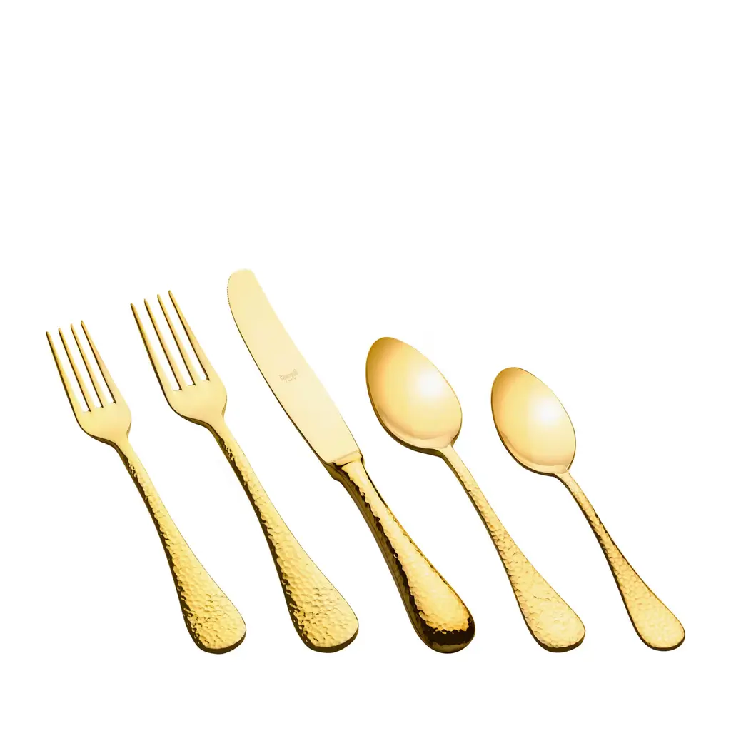 Boasting a luxurious gold plating, this brass cutlery set comprised of six forks and six knives in three different designs will give an elegant touch to special dinners with family or friends. The set comes housed in refined boxes and is also available in silver or rose-gold variants upon request to the Concierge.
