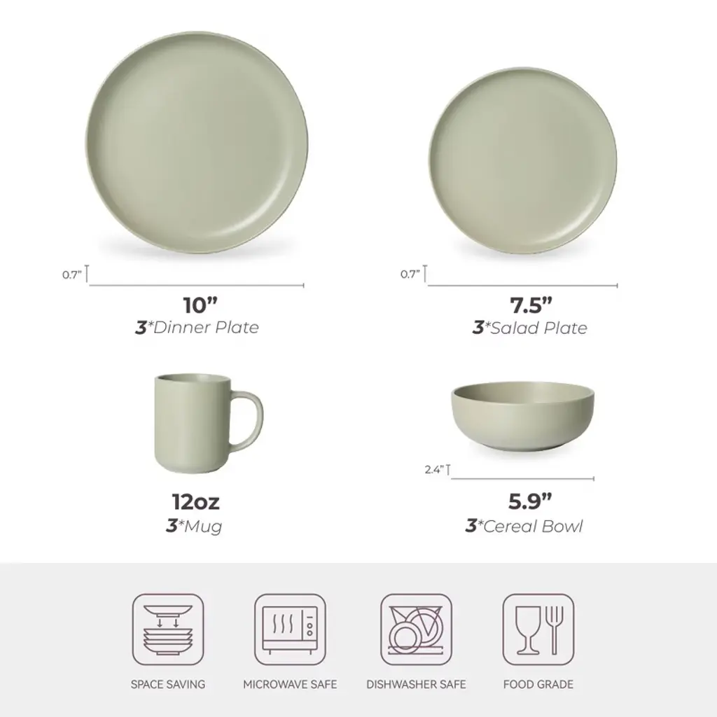 12-Piece Stoneware Dinnerware Sets with Mugs | Microwave & Dishwasher Safe | Non-Toxic Dinner Plates Bowls Set | Stackable Matte Glaze Kitchenware for 3,Green