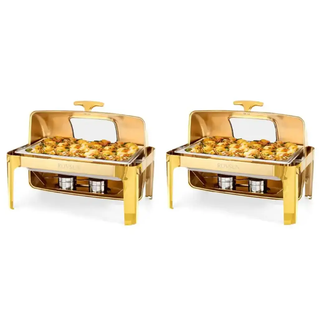 1. Premium Material: ROVSUN 9 qt rectangular roll top chafing dish buffet set gold made of food-grade stainless steel, it features safety and durability. Rust-proof and heat or cold resistant features allow longer service life. Besides, stainless steel construction is easy for cleaning with dish washing liquid and dried with a soft towel.The food pan, water pan and cover are dishwasher safe.2. Gold Design: Features with gold design create a textured metal sense, elegantly display catering food straight from the oven onto the buffet table. Perfect for restaurant or hotel commercial use .3. 90/180° Roll Top & Glass Window: 180° full opening or 90° intermediate opening options , upgraded bearing makes opening and closing easy, provides convenient serving. And features with the visible window which can see what is in the pans without opening the lid.It is perfect for buffets, hotel breakfast and brunch areas, wedding, parties, banquets and any events. 4. Maintain Food's Temperature: The frame includes a bottom tray which supports 2 fuel holders to store fuels for heating food, just like someone just turned the stove off. You can also put ice in the water pan if you want to cool down the food.Make sure your food stay as warm as it needs for buffet or events.