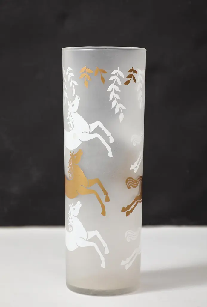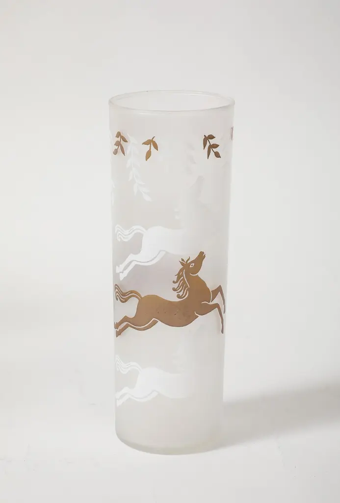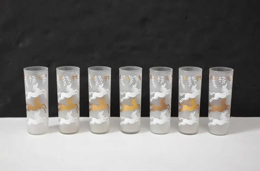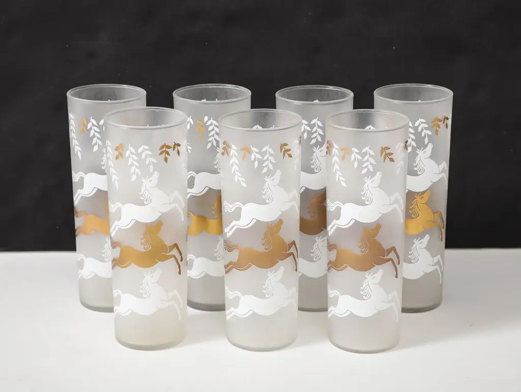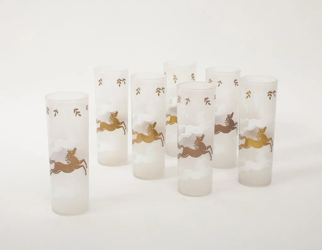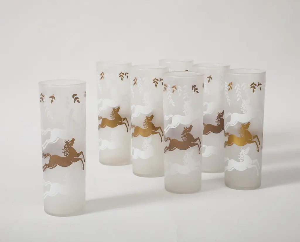 Mid Century frosted cocktail glasses featuring galloping horses in white and gold. 14 in total included in this set.