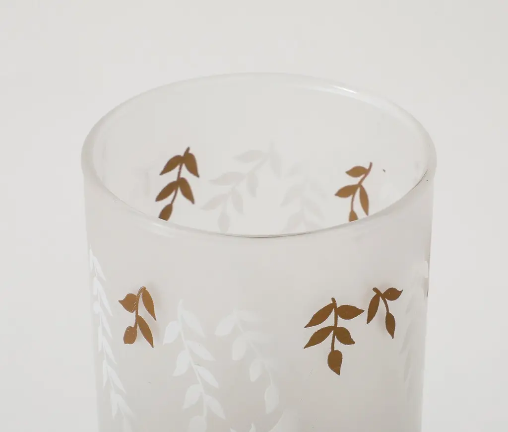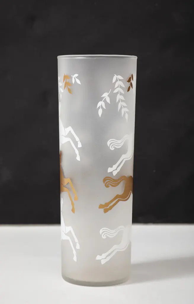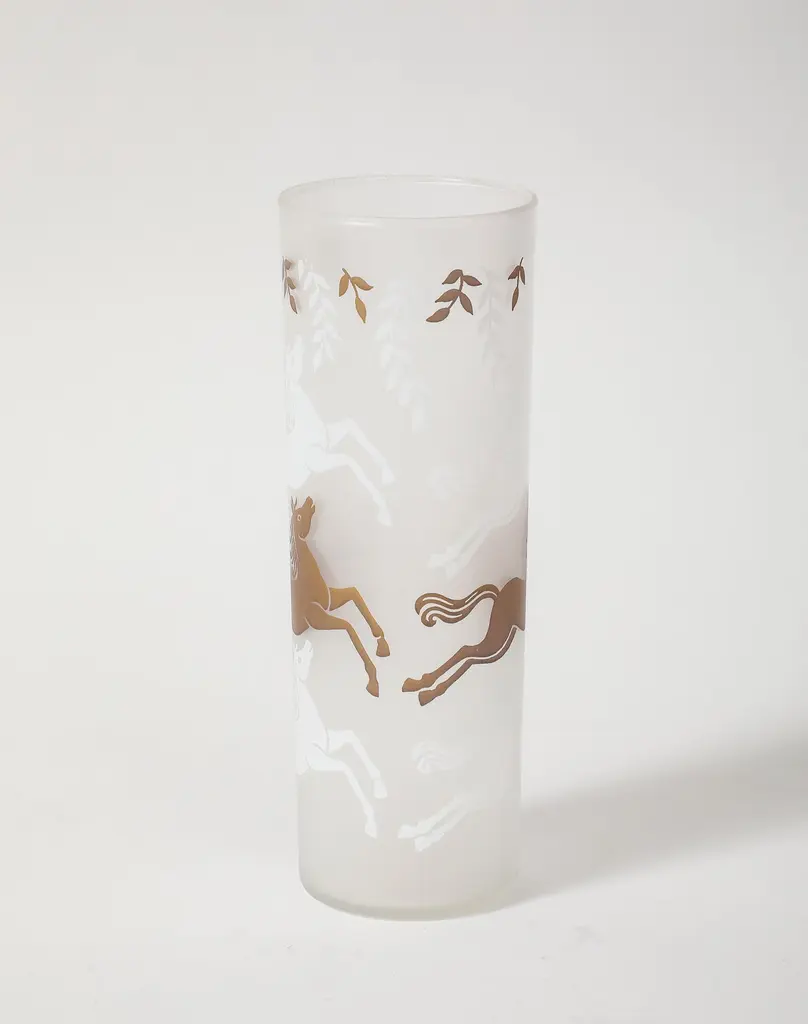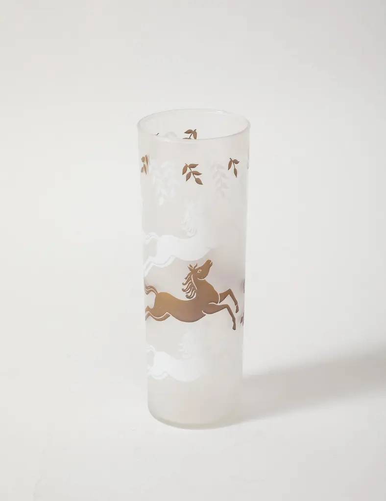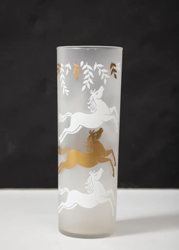 Mid Century frosted cocktail glasses featuring galloping horses in white and gold. 14 in total included in this set.