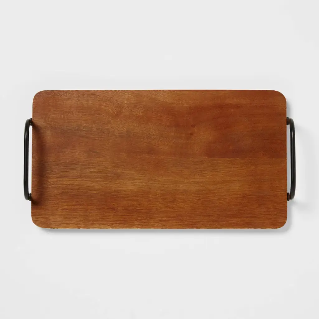 Bring some rustic charm to your serveware by adding this Wood Serving Board from Threshold™. Carved out of wood in a natural finish, this serving board is designed in a rectangle shape with slightly curved corners for a sleek look you'll love. Accented with two black metal handles on both sides for easy lifting and moving, this rectangle serving board makes a convenient spot for your fruits, baked goods and more.