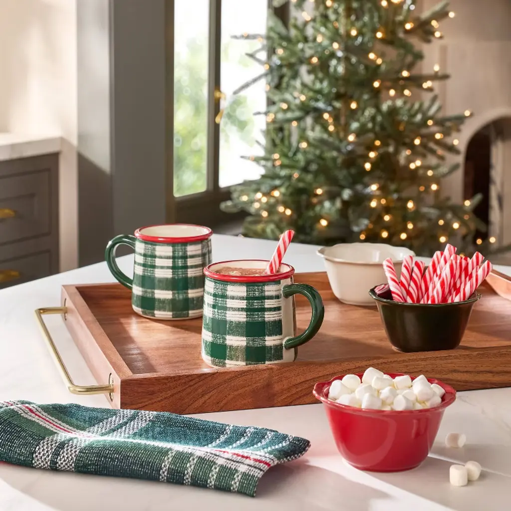 Enjoy the warmth of the festive season with this 14oz Holiday Mug Green Plaid from Hearth & Hand™ with Magnolia. Made of stoneware material, this mug features green and cream plaid design with a red rim for festive charm. With a capacity of 14 fluid ounces, it's ideal to sip your favorite hot and cold beverages. Plus, it is dishwasher and microwave safe for easy cleaning and reheating. Hearth & Hand™ with Magnolia: Gather • Create • Enjoy