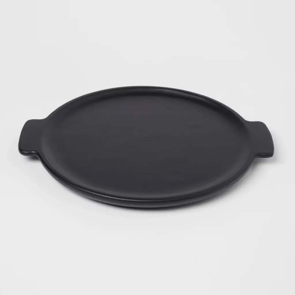 Present and serve your dishes in style with Black Acacia Modern Serving Board from Threshold™. This acacia serving board brings style and function to your dining table. It feature a solid black varnished finish for a sleek, modern look that pairs with any table decor. This round serving board is perfect for serving freshly cut fruits, cheeses, appetizers and more. It comes with an attached handle at one end that provides a grip for convenient carrying, and it can be spot cleaned for easy care.