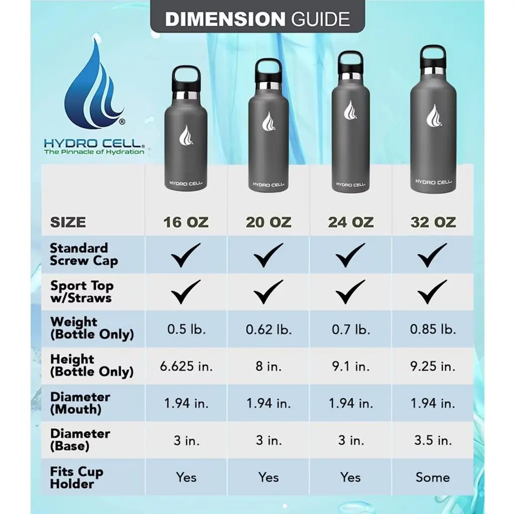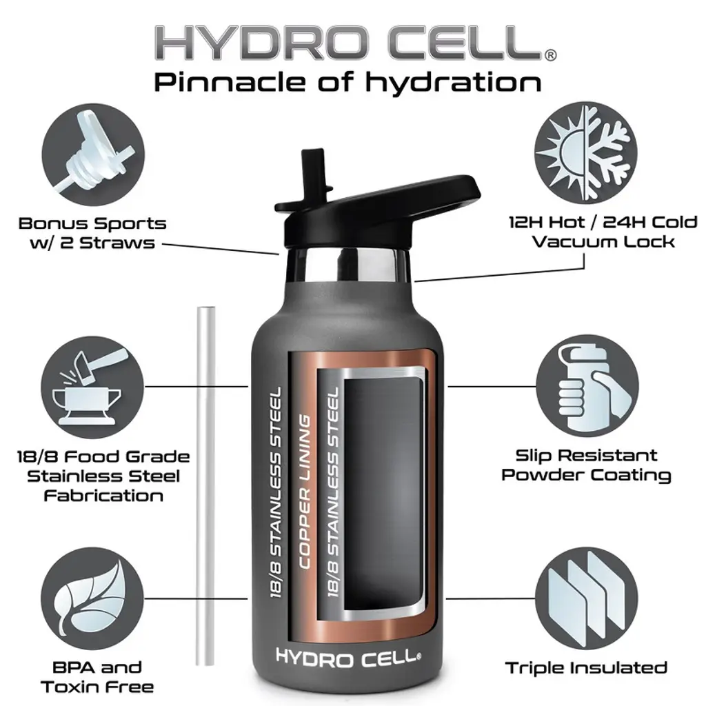 Stay hydrated and on the move with the best stainless steel water bottle for fitness, work, and outdoor adventures. Are you looking for a water bottle that keeps drinks ice cold or super-hot for hours on end for ultimate freshness? Then you need the Hydro Cell Stainless Steel Water Bottle crafted with a double-walled, vacuum-sealed design that holds in temperatures, eliminates condensation, and ensures all your favorite drinks taste better. Stylish and Durable The Hydro Cell is made for those who live for adventure or simply lead busy lives. Made with premium-grade stainless steel, our leakproof water bottles feature a standard-mouth top for adding ice cubes and easier drinking. What is more, it is versatile enough to use quickly after Yoga or CrossFit, durable enough to take to the beach or lake, and contemporary enough to use in the kitchen or to take to work. If you are looking for a multipurpose water bottle that keeps drinks ice cold in the summer and hot and delicious in the dead of winter, then you need the Hydro Cell Stainless Steel Water Bottle. Product Details: Premium Stainless Steel, Double-Walled and Vacuum Sealed, Keeps Drinks Cold for 24 Hours, Keeps Drinks Hot for 12 Hours, Leakproof Lid, BPA Free, Bottle comes with two caps: a screw-in cap and an additional sports cap with flip straw to ensure that your favorite beverages maintain the perfect temperatures, Hand Wash Only, Satisfaction Guaranteed.