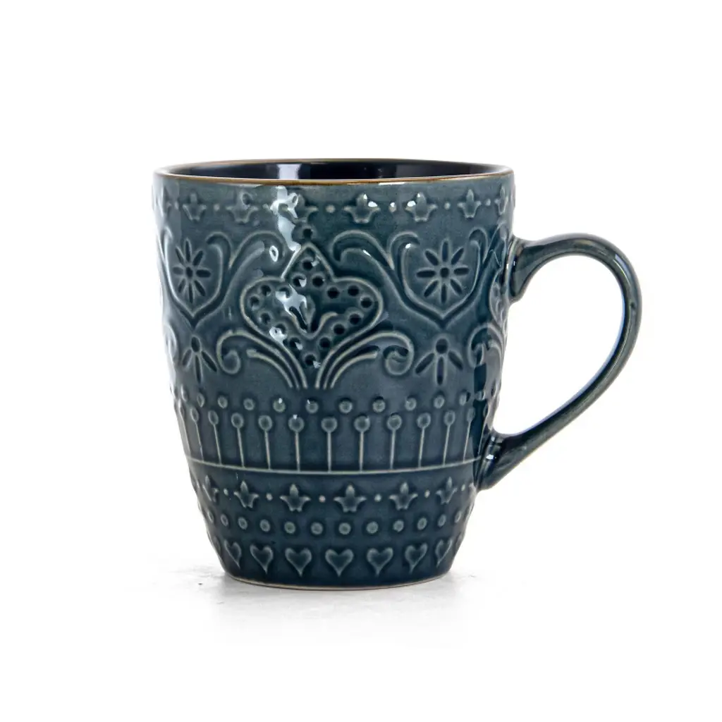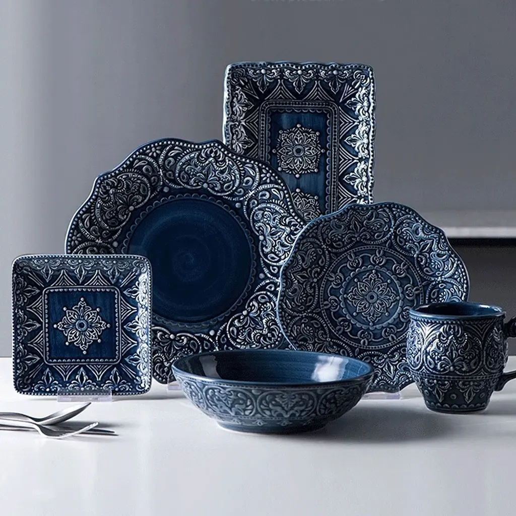 Freshen up your table setting with the textured Elama Blue Mural 16 Piece Round Stoneware Dinnerware Set in Sea Blue. With a calming tone of Sea Blue and textured mandala style designed plates, this set is ready to make a statement at your next gathering. Ideal for every day casual settings as well as formal gatherings. Constructed from high quality stoneware for a durable and long lasting design.