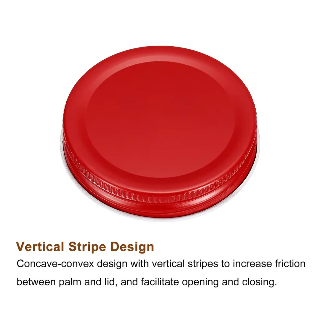 Description:Material - Constructed from a thin steel plate as the substrate, tin plated on its surface and multi-protective films(layers). With corrosion resistance, odorless, glossy surface, lightweight and strong adaptability to ambient temperature.Airtight & Leakproof - Designed to fit standard mouth mason jars. Our jar lid with a gasket which can improve the sealing of the lid, keep food fresh longer, not easy to leak, and prevent bad odors.Vertical Stripe Design - Concave-convex design with vertical stripes to increase friction between palm and lid, and facilitate opening and closing.Washable & Reusable - The canning lid is washable and suitable for the dishwasher. Please wash the lids before use and it is better to dry to store them as soon as possible, in order to extend service life and not easy to rust.Wide Applications - Commonly apply on mason jars for dry or liquid sealing and storing, such as grains, sugar, flour, juice, fruits, salad, sauces, spices, jams, etc. As well as for making DIY projects, seasoning caps, handmade decorative chandeliers, small items storage and more.Specification:Material: Tin PlateColor: RedInner Diameter: 70mm/2.76-inchLid Height: 15mm/0.59-inchPackage Contents:16pcs x Mason Jar Lids