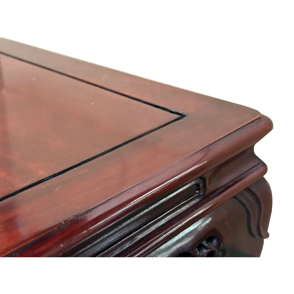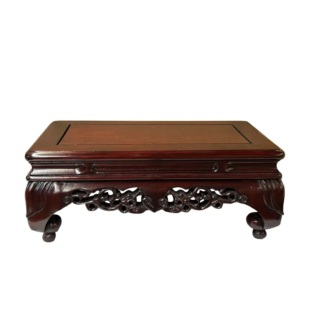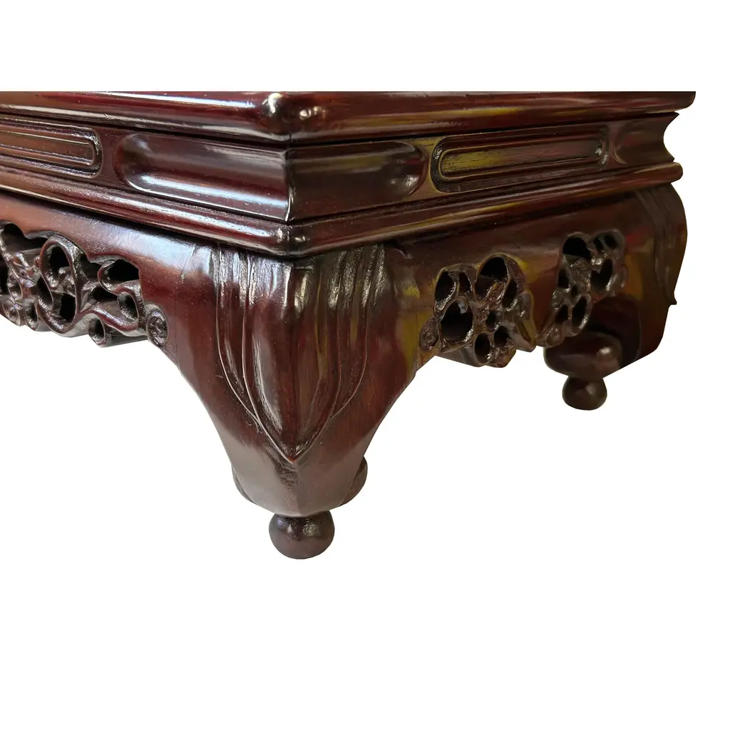 Showcase your treasured items with a touch of classic elegance using the Reddish Brown Rosewood Rectangular Dragon Crawl Legs Display Stand Riser. Crafted from premium rosewood, this stand features a rich reddish-brown finish that highlights the wood's natural beauty and intricate grain patterns. The rectangular design provides a sturdy and spacious platform, perfect for displaying everything from decorative objects to collectibles. What sets this stand apart is its striking dragon crawl legs, which are exquisitely carved and add a dramatic, yet refined, flair to the piece. These legs, inspired by traditional Chinese artistry, evoke a sense of power and grandeur, enhancing both the stand and the items it supports. Ideal for both contemporary and traditional settings, this display riser not only elevates your items but also adds a sophisticated, artistic element to your decor. Its durable construction and timeless design make it a versatile and valuable addition to any home, office, or gallery space. Dimensions: body w18" x d11"x h7", top 17" x 10" Origin: China Material: Wood Condition: Handmade, natural wood marks, variation wood pattern tone, scratch lines USA domestic continental buyers of 48 states pay $65 shipping