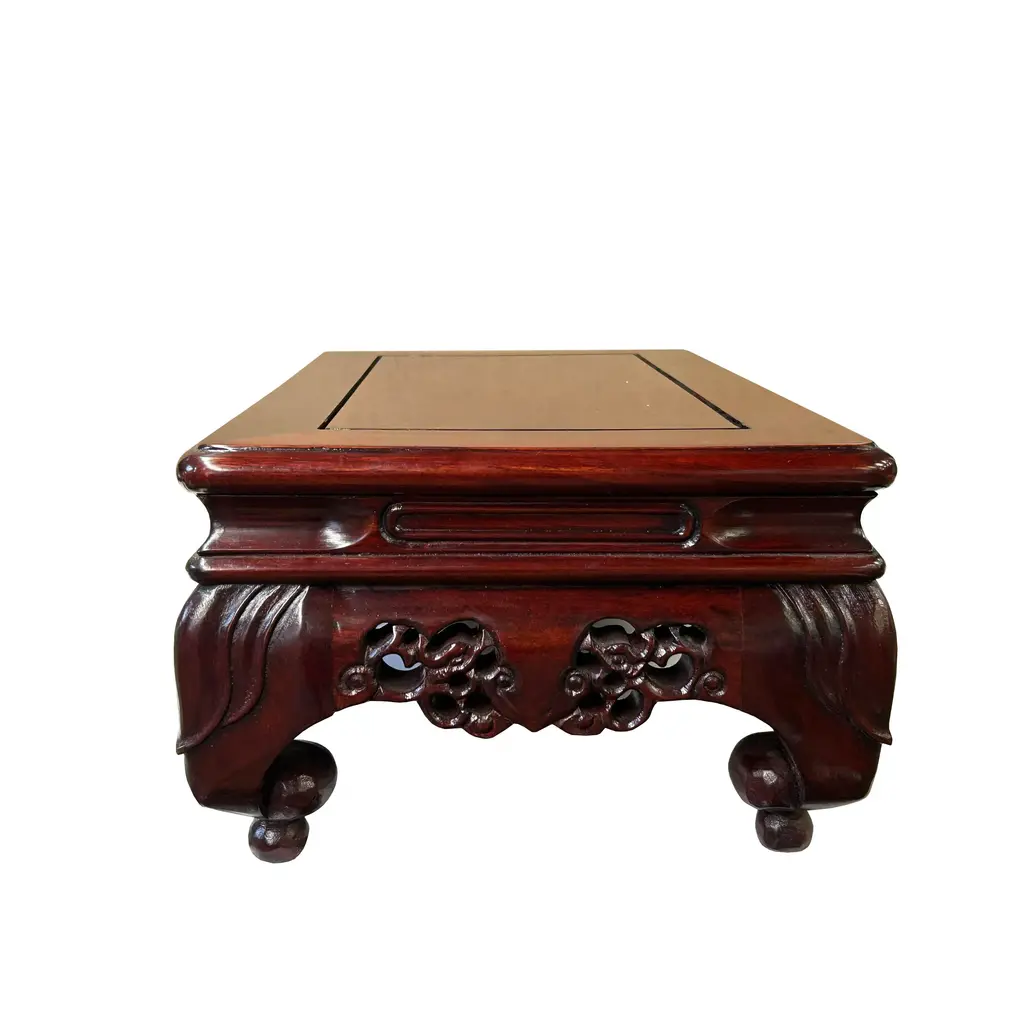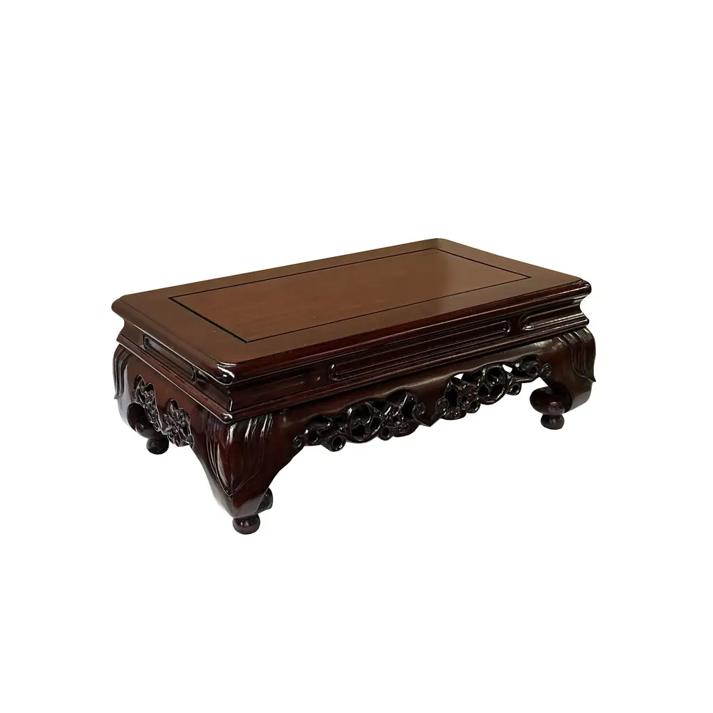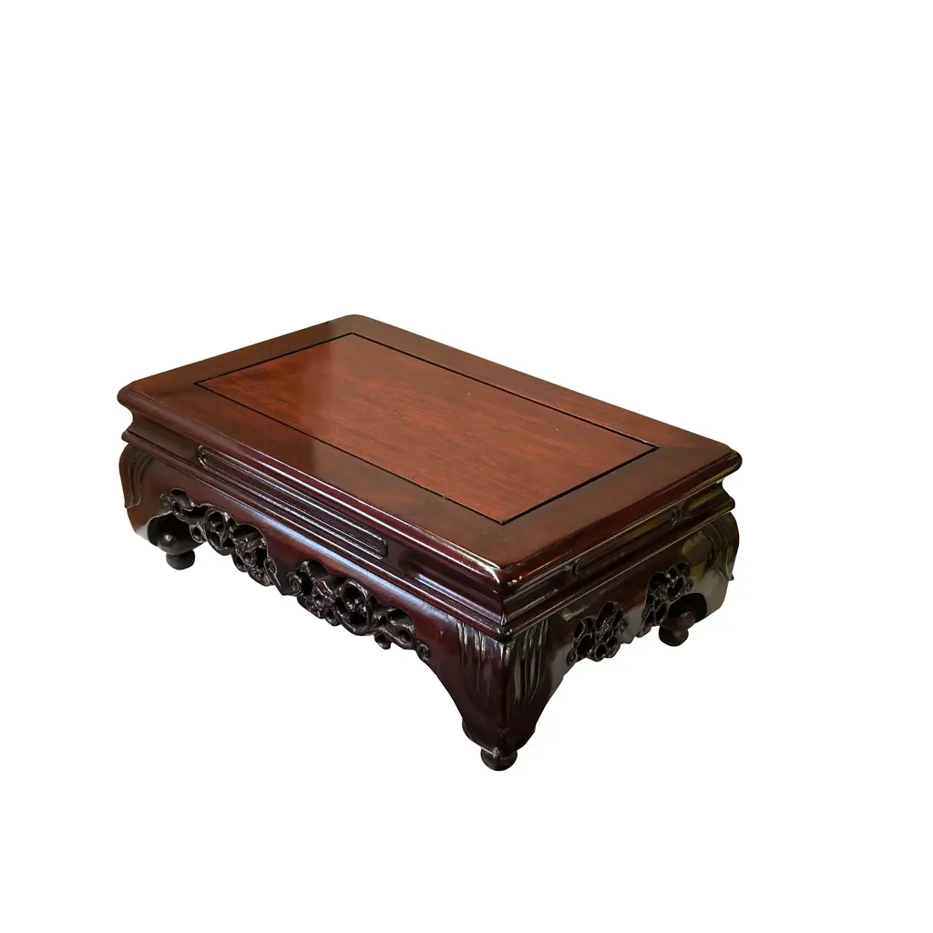 Showcase your treasured items with a touch of classic elegance using the Reddish Brown Rosewood Rectangular Dragon Crawl Legs Display Stand Riser. Crafted from premium rosewood, this stand features a rich reddish-brown finish that highlights the wood's natural beauty and intricate grain patterns. The rectangular design provides a sturdy and spacious platform, perfect for displaying everything from decorative objects to collectibles. What sets this stand apart is its striking dragon crawl legs, which are exquisitely carved and add a dramatic, yet refined, flair to the piece. These legs, inspired by traditional Chinese artistry, evoke a sense of power and grandeur, enhancing both the stand and the items it supports. Ideal for both contemporary and traditional settings, this display riser not only elevates your items but also adds a sophisticated, artistic element to your decor. Its durable construction and timeless design make it a versatile and valuable addition to any home, office, or gallery space. Dimensions: body w18" x d11"x h7", top 17" x 10" Origin: China Material: Wood Condition: Handmade, natural wood marks, variation wood pattern tone, scratch lines USA domestic continental buyers of 48 states pay $65 shipping