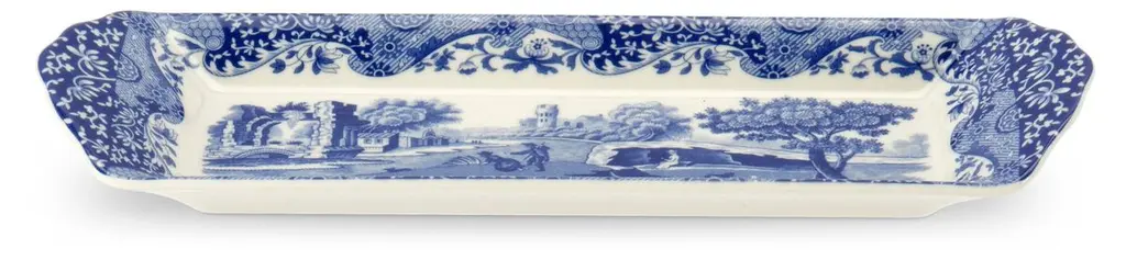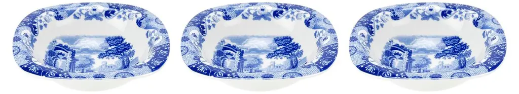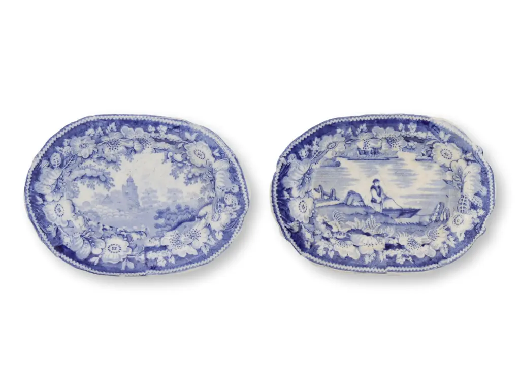 Pair of Antique English Pearlware small serving dishes, graced with idyllic blue pastoral scenes. Each platter is framed by a decorative floral border, bringing refined elegance to any setting. As with most early transferware, there are no makers marks.