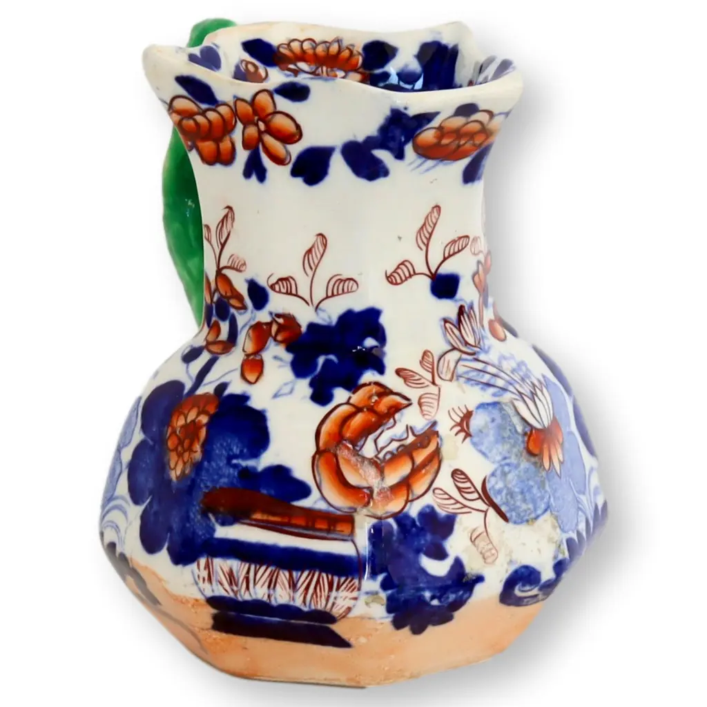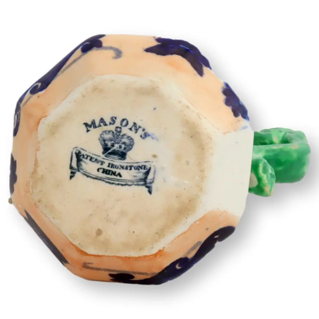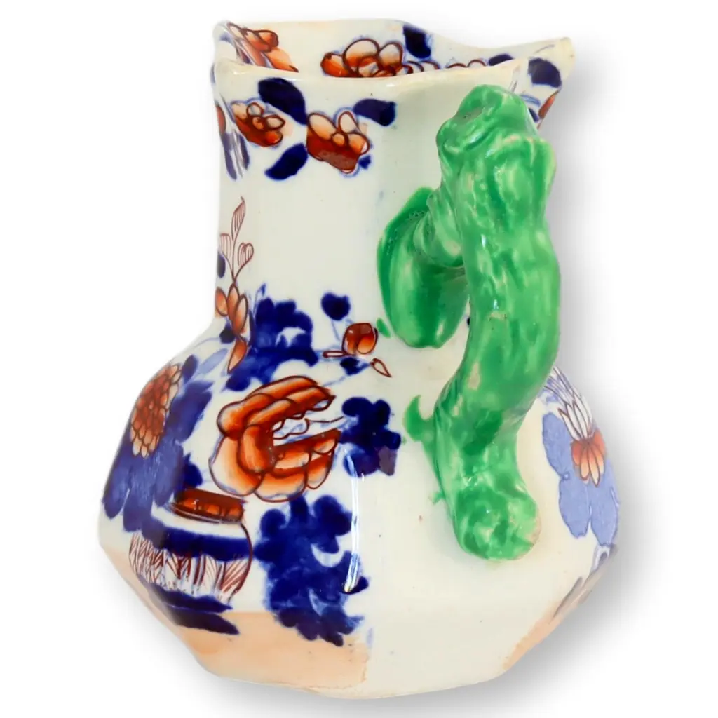 Early Mason's Ironstone octagonal jug with green crabstock handle. A "crabstock" handle was a fairly common feature in early English pottery, it imitates a crabapple tree branch with the side branches trimmed off. Bold ironstone colors in the 'Japan Basket' pattern. Maker's mark on underside, dating it to circa 1840s.