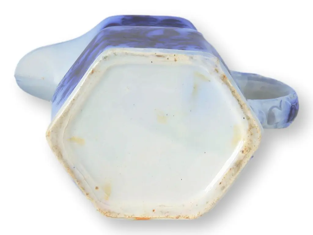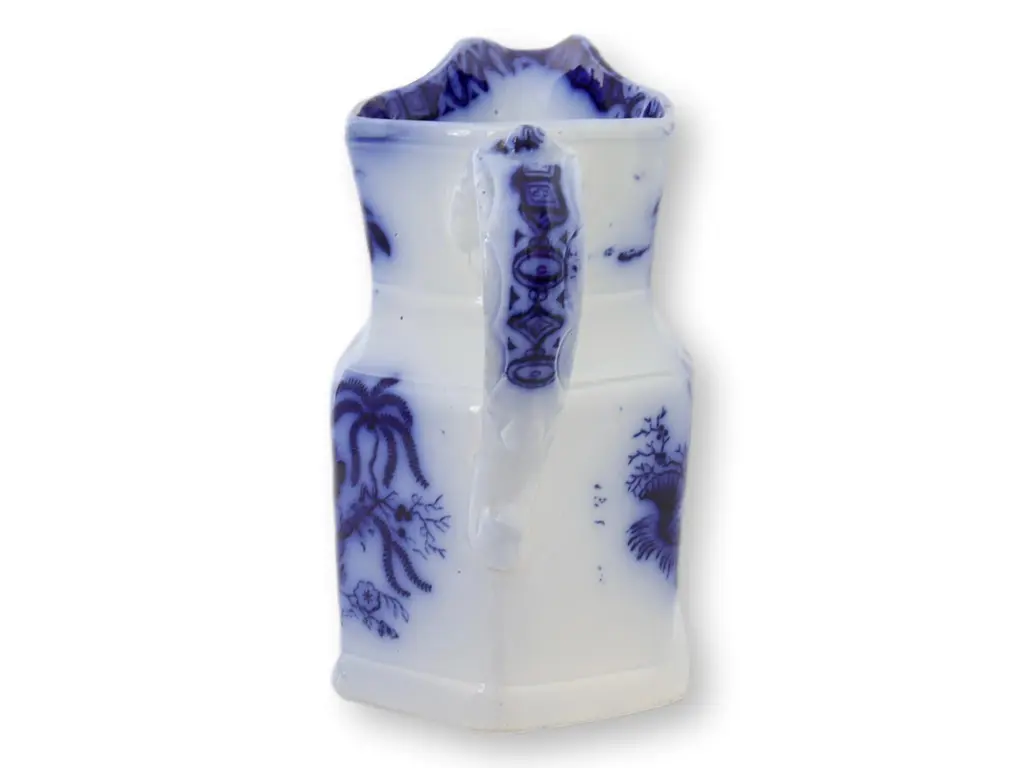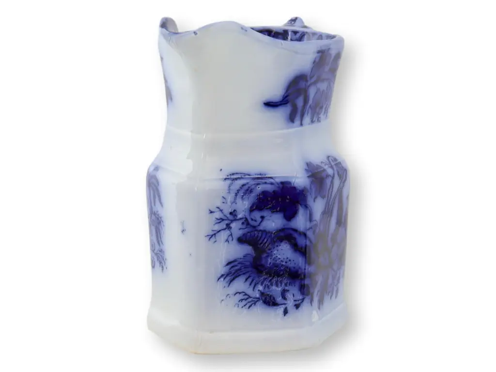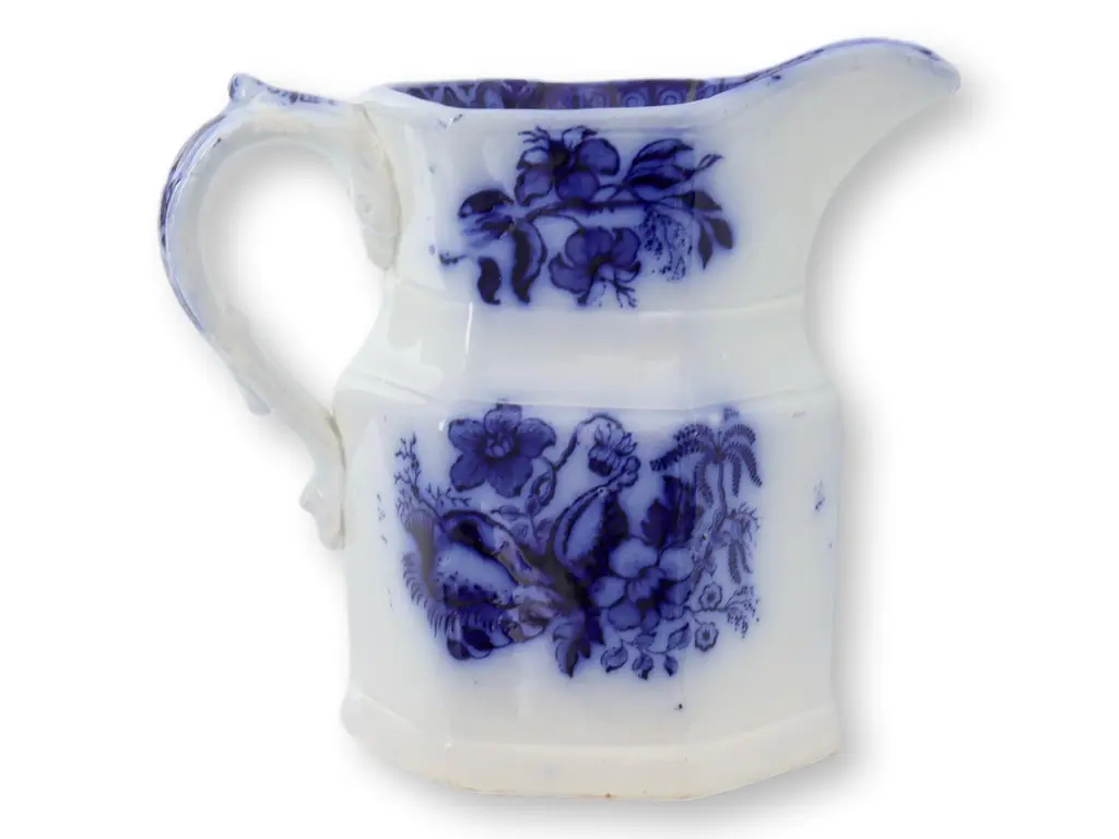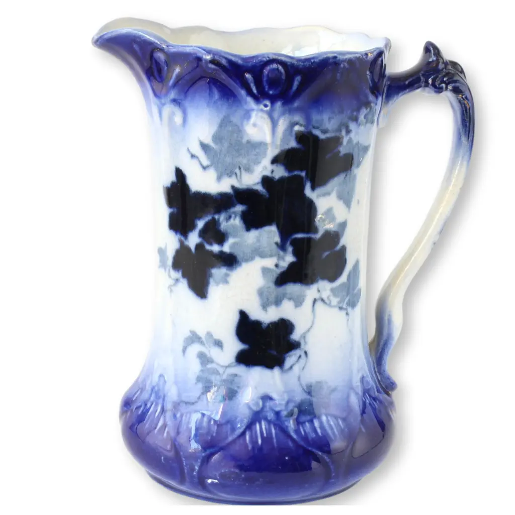 Dive into the rich tapestry of mid-19th century English ceramics with this exquisite flow blue pitcher. Adorned with a detailed seashell pattern, it radiates deep cobalt hues that gracefully bleed into the pristine white ironstone, a signature characteristic of the flow blue technique. This piece is not only a functional vessel but a stunning example of craftsmanship from a bygone era, making it a must-have for collectors and connoisseurs of classic pottery.