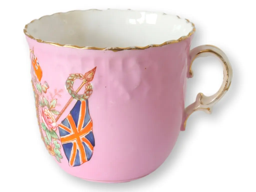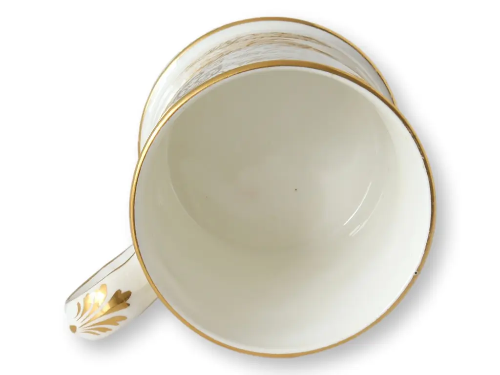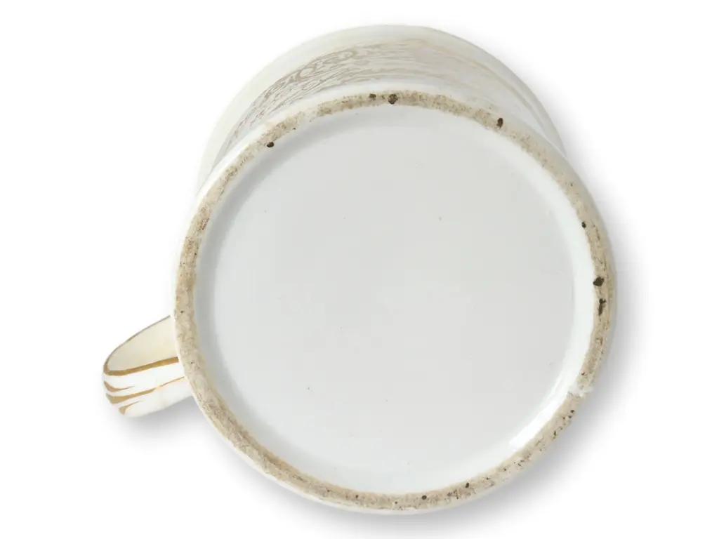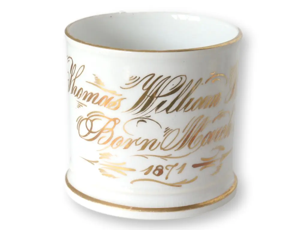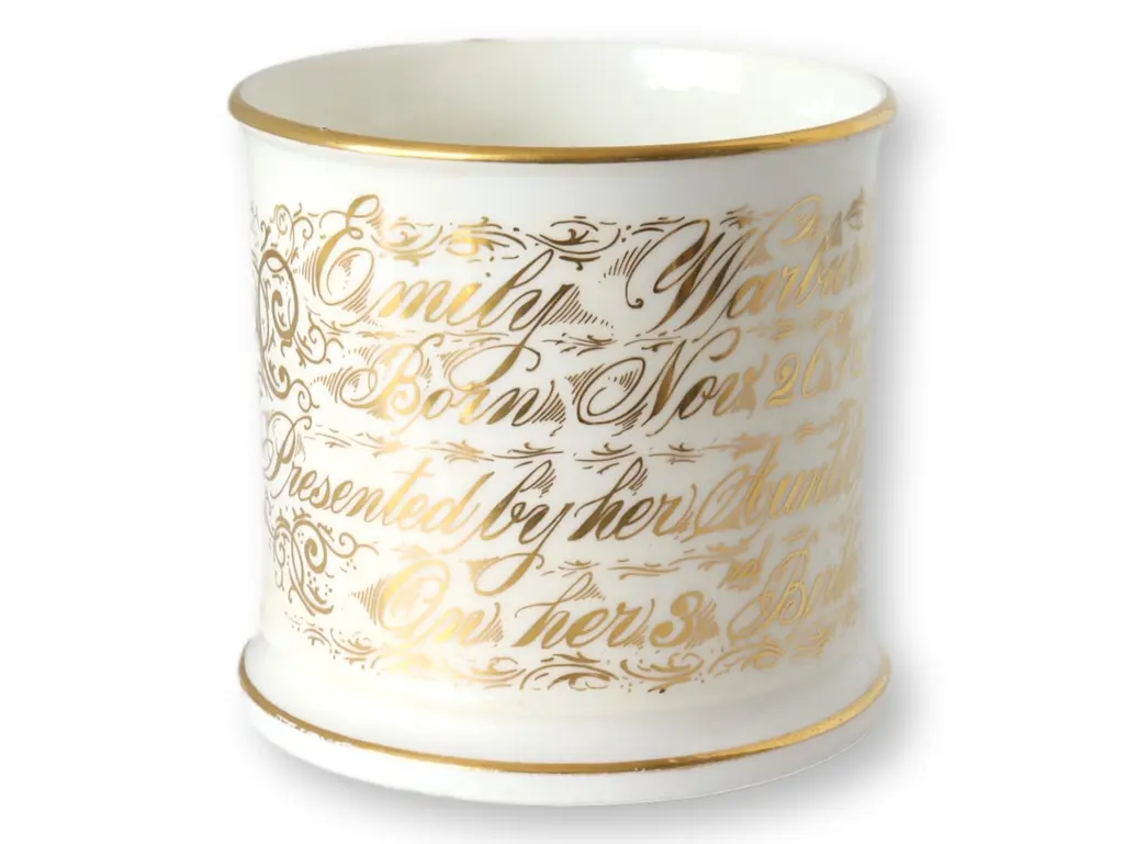 This stunning Victorian porcelain presentation mug features intricate gilded inscriptions, commemorating Emily Warburton's 3rd birthday in 1881. The elegant gold detailing and script make this a highly collectible and personal artifact from the Victorian era. The beautifully preserved gilding adds a touch of luxury, making it perfect for collectors of unique historical memorabilia or as a decorative piece. A rare find with significant personal history.