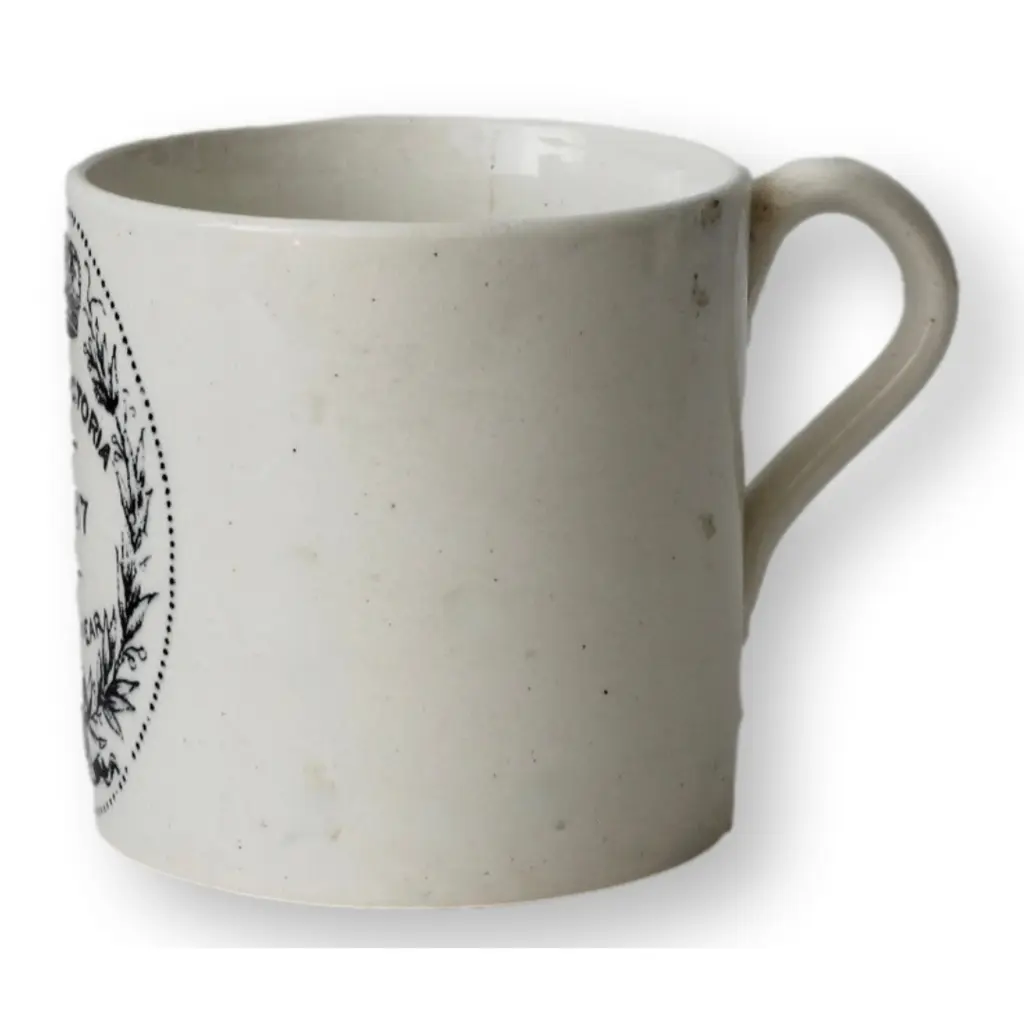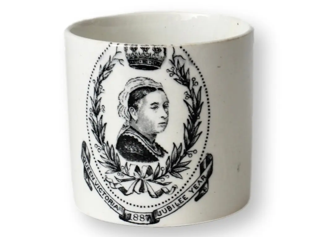 Commemorative mug honors Queen Victoria’s Golden Jubilee in 1887. Decorated in black transferware, one features a portrait of the Queen, while the other bears a crowned laurel wreath with the inscription ��Queen Victoria Jubilee Year 1887������. A classic Victorian tribute to Britain������s longest-reigning monarch at the time, perfect for collectors of royal memorabilia.
