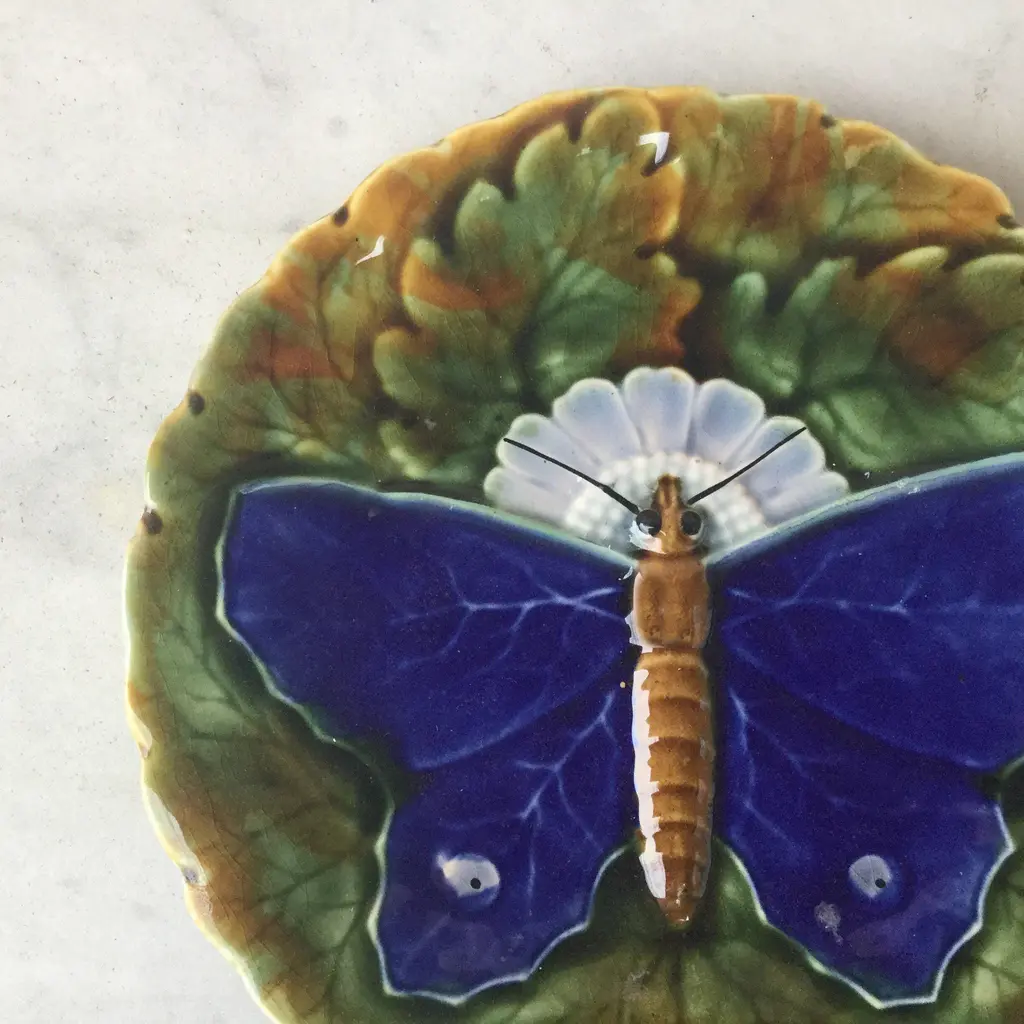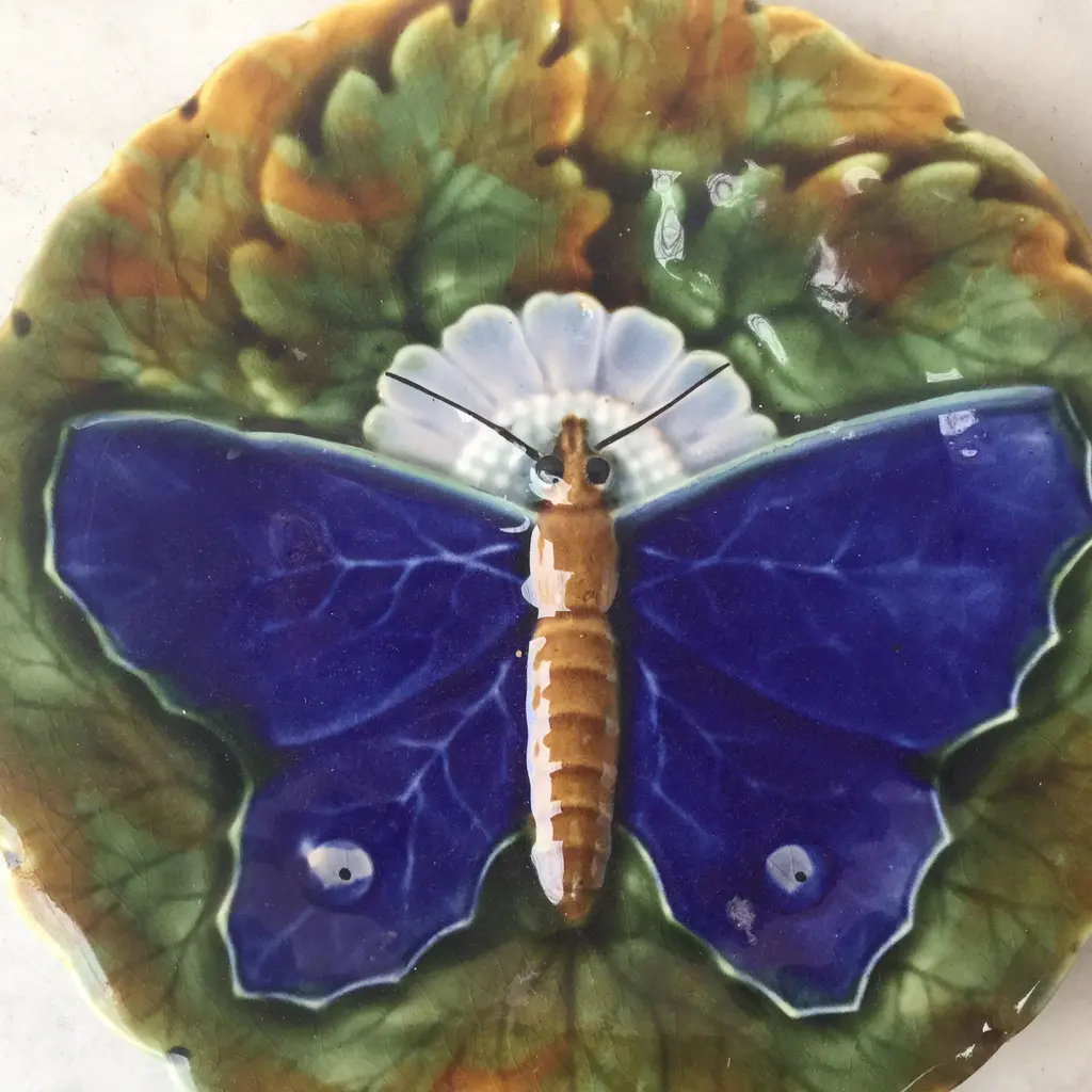 1890 Antique Josef Steidl Znaim Majolica Blue Butterfly Plate