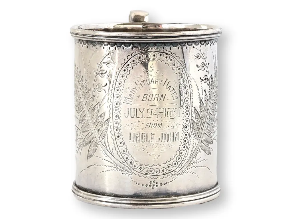 A beautifully engraved Victorian-era birth mug, inscribed "Mary Stuart Yates, Born July 24th, 1891, From Uncle John." The delicate fern and floral engravings showcase the craftsmanship of the period, while the rolled rim and beaded detailing add an elegant touch. A sentimental piece of antique silverplate, perfect for collectors of Victorian memorabilia, heirloom gifts, or nursery antiques. No maker's mark.
