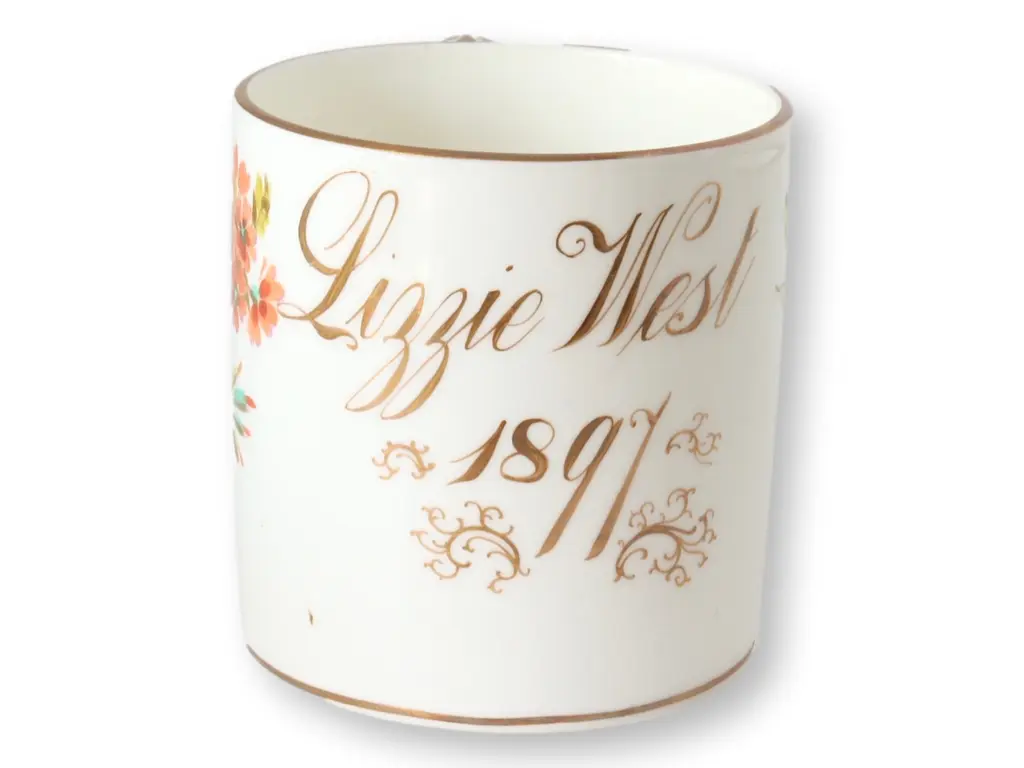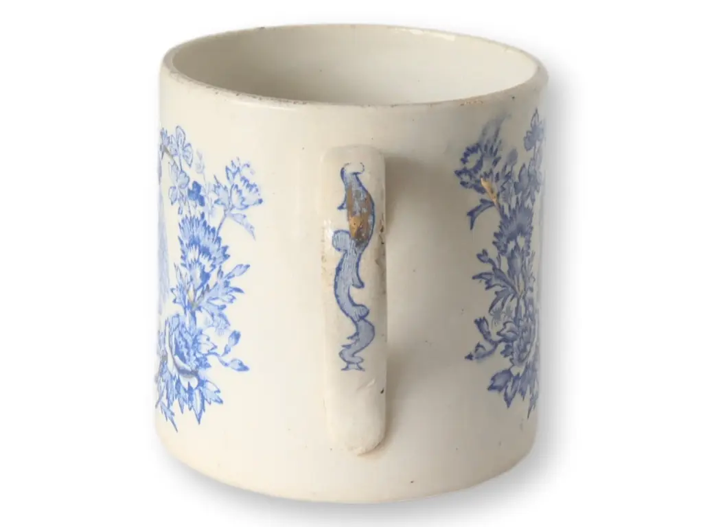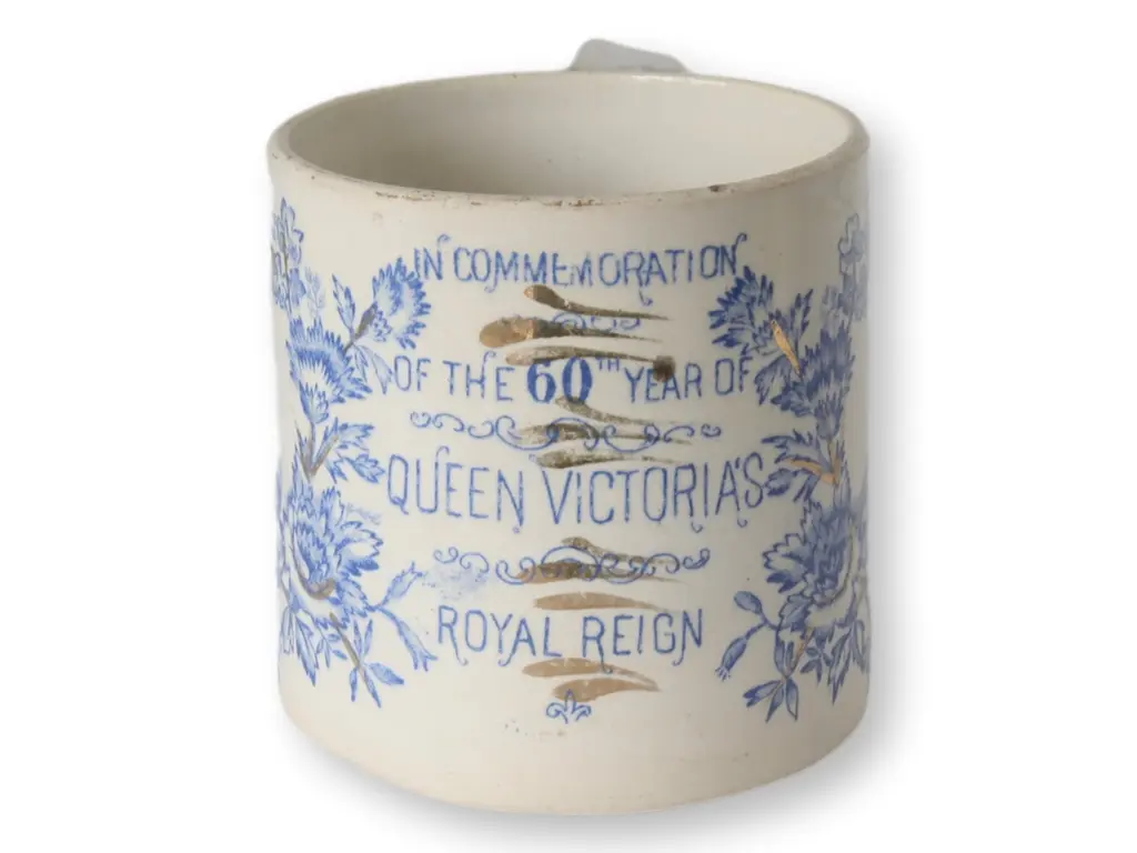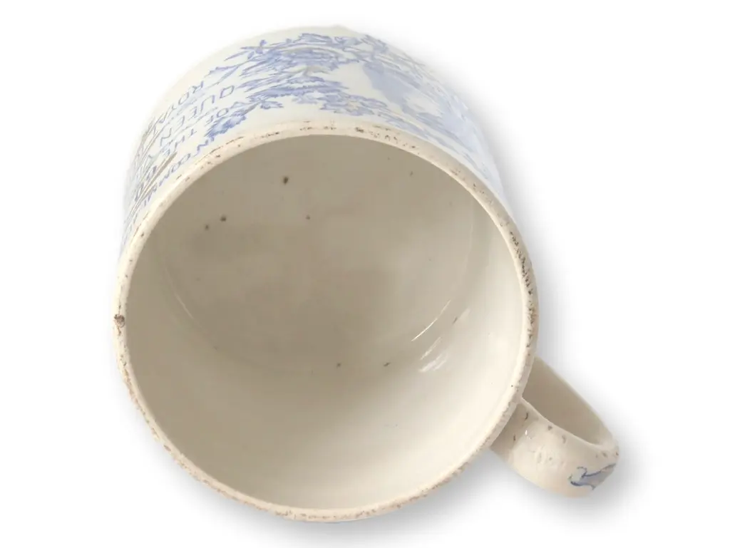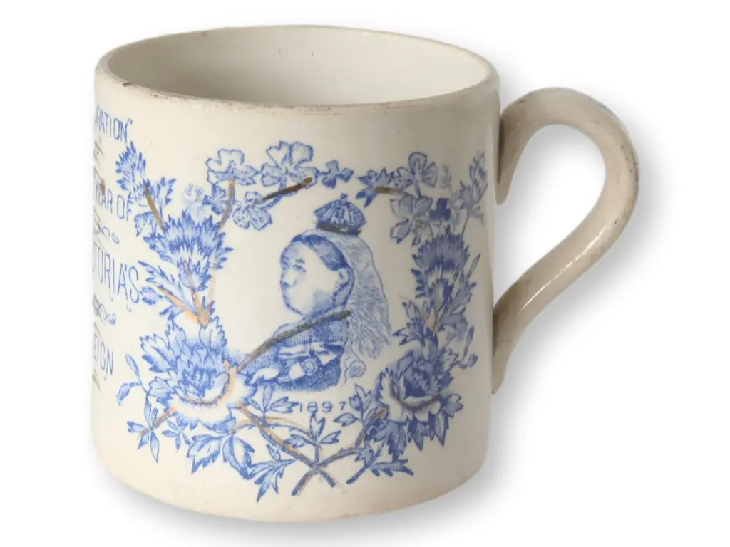 Exceptionally rare Queen Victoria Diamond Jubilee mug from 1897, celebrating 60 years of her reign. Featuring its original lustre gilding, this blue transferware mug is adorned with floral motifs and portraits of the Queen. The preserved gilding enhances its historical and collectible value. Perfect for collectors of royal memorabilia or historical artifacts, this unique piece offers a glimpse into Victorian craftsmanship and British history.