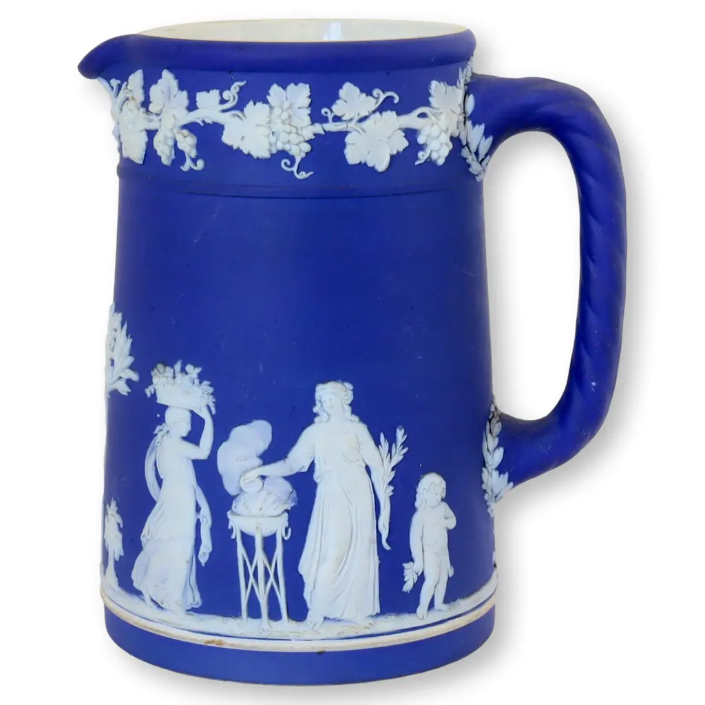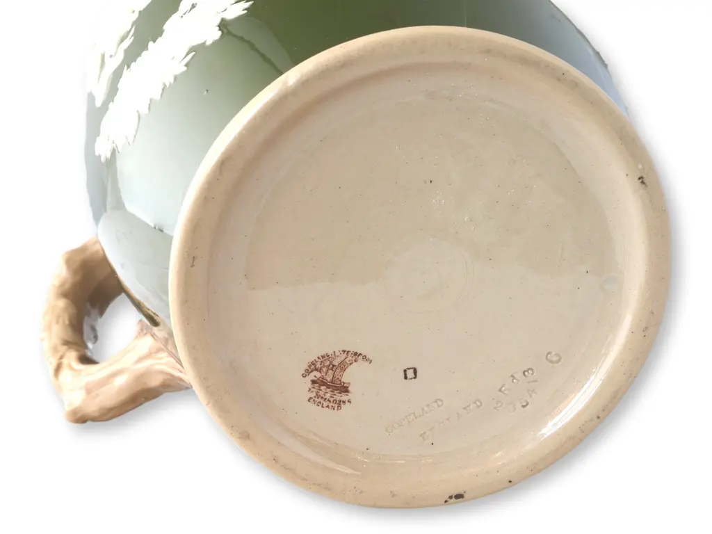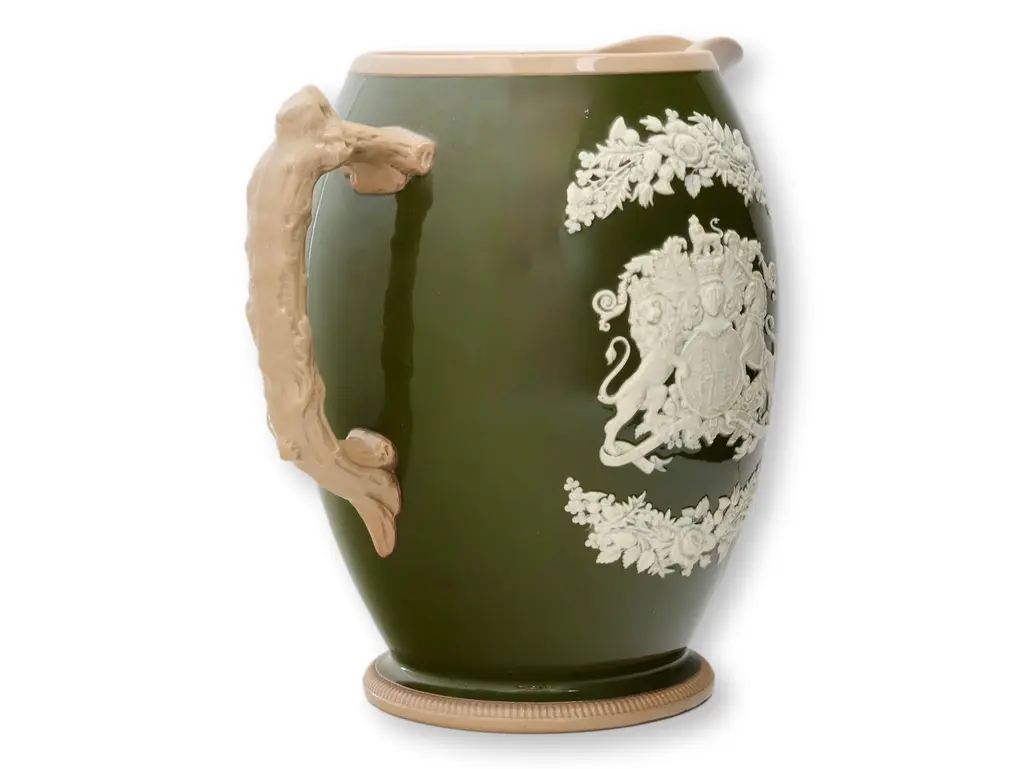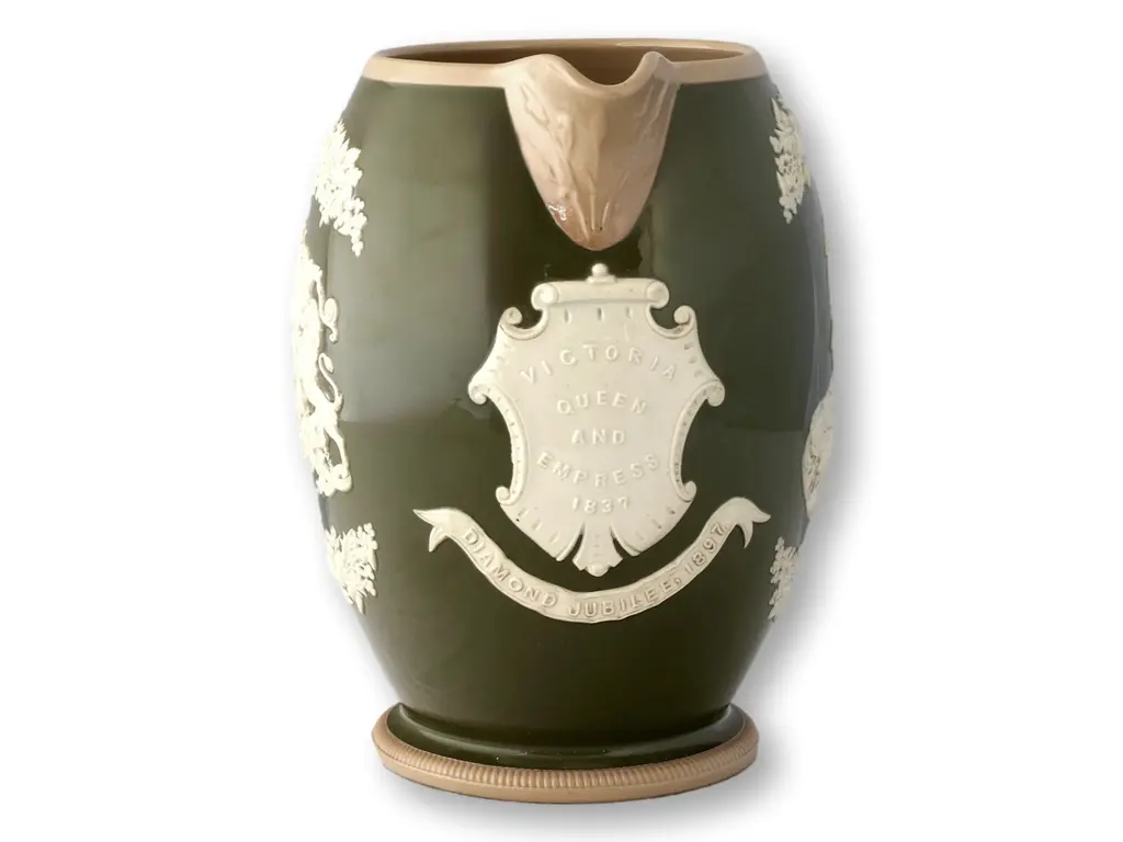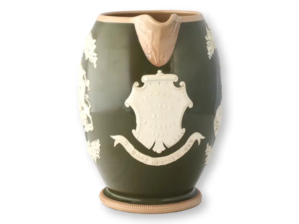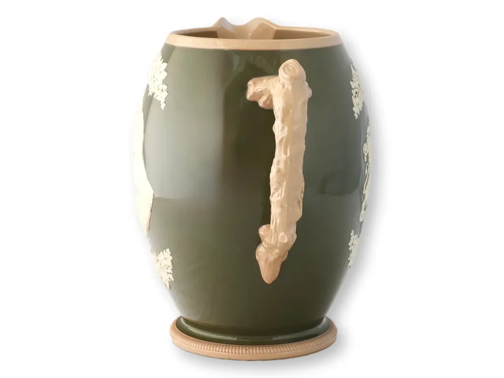 This exceptional Copeland Spode jug was created in 1897 to commemorate Queen Victoria's Diamond Jubilee, marking her 60-year reign. Featuring a striking olive green body adorned with white bas-relief portraits of Queen Victoria, floral garlands, and a regal shield, it epitomizes Victorian artistry and grandeur. The branch-like handle adds a charming natural touch. A rare and collectible piece, this jug is a beautiful tribute to British history and craftsmanship. Signed on bottom.